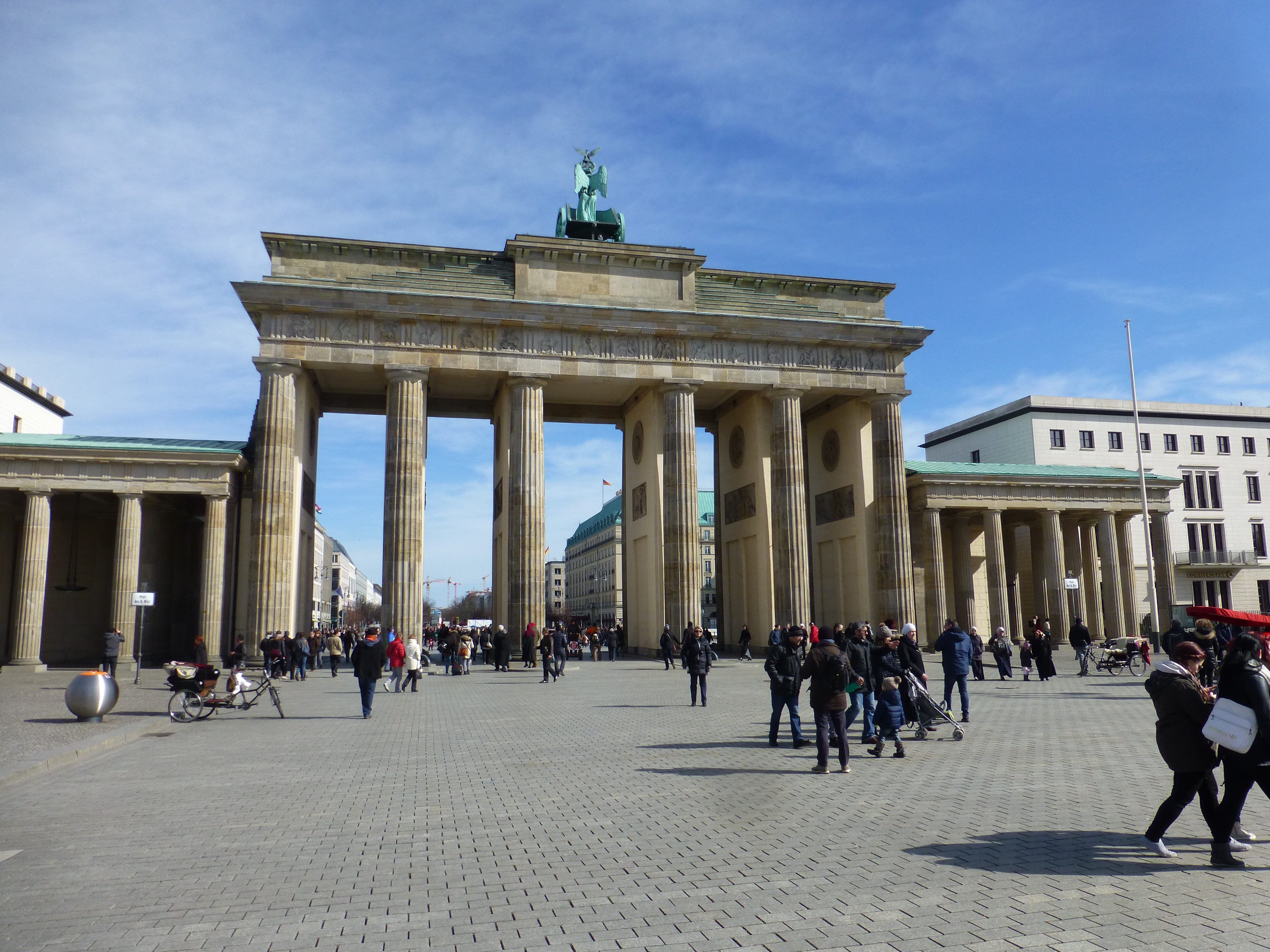 + 2°C, vent glacé, mais ciel d’azur: Nous attaquerons la visite avec nos tenues d’hiver. Il s’agit pour nous d’un tour de chauffe car nous pensons y passer plus de temps au retour. Pour cela les bus Hop on Hop off sont la solution idéale et nous parcourrons la « bande gouvernementale » autour de la porte de Brandebourg avec la nouvelle Chancellerie, le Reischtag et les nouveaux bâtiments du parlement, puis les restes du mur de la honte autour de Check Point Charlie, où des figurants en uniforme posent pour les photos des touristes ( les Vopos qui m’y avait contrôlé en 1974 étaient nettement moins souriants!)
