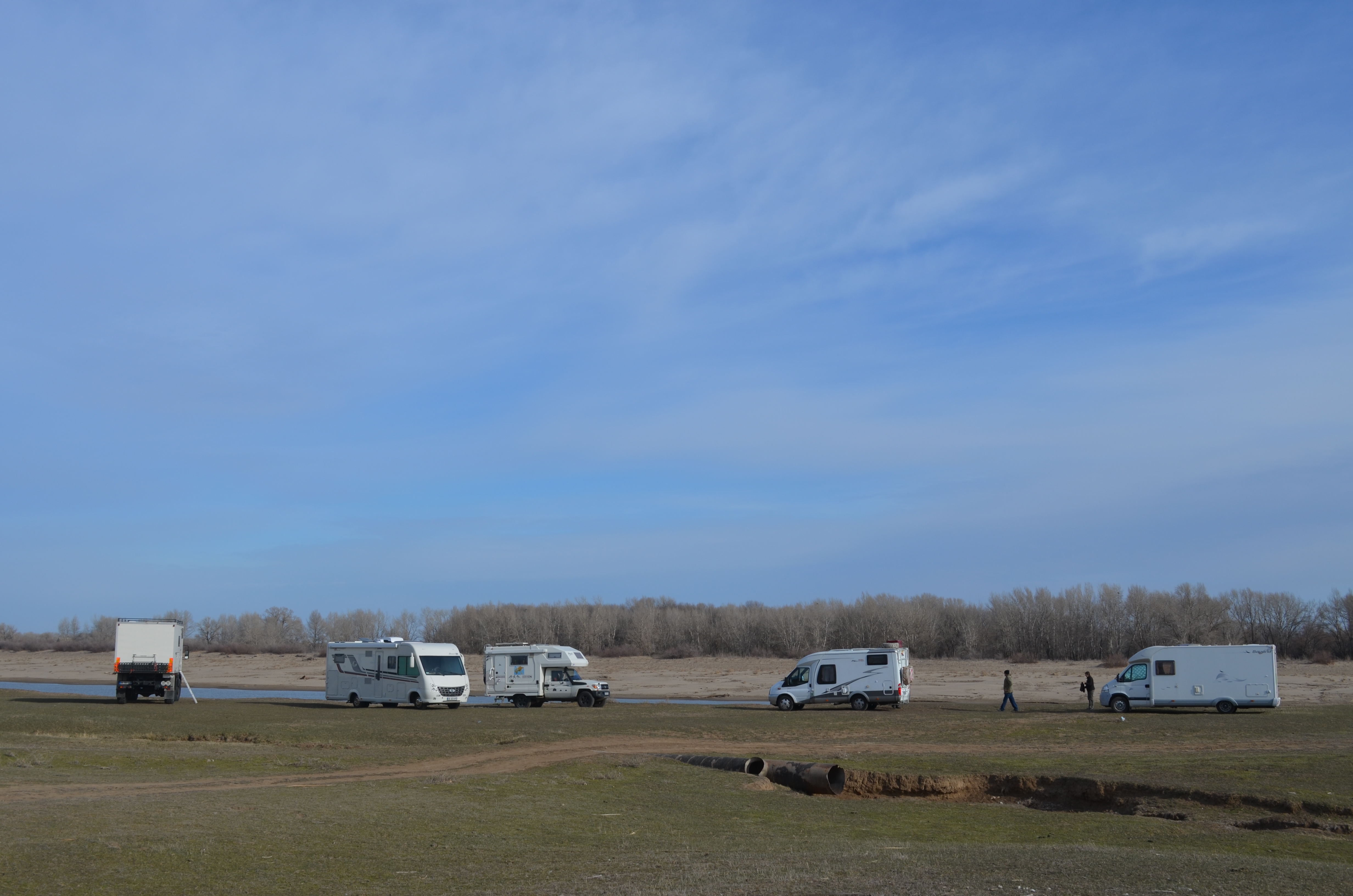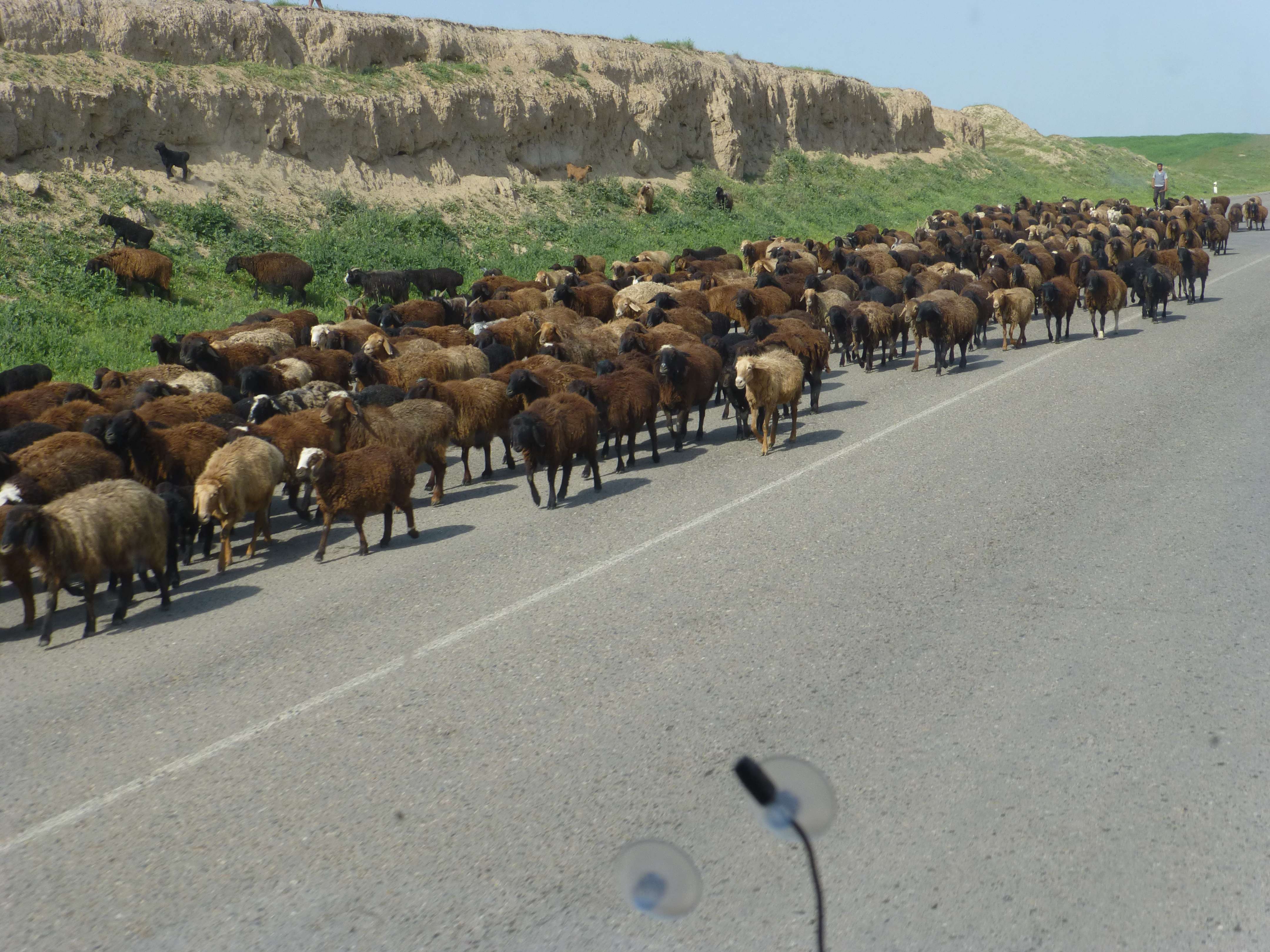 Petit débat avec le réceptionniste de l’hôtel qui veut nous imposer une taxe au-delà du tarif convenu, réglé par un coup de fil à sa responsable. Quelques aller retour dans la ville pour trouver la bonne direction et nous quittons Samarkand à l’heure où les jardiniers lancent les arrosages des pelouses, où les petits retardataires en uniforme courent vers l’école, le cartable tressautant au bas du dos, et où les chauffeurs de car donnent le dernier coup de chiffon sur leurs chromes avant de charger leur plein de touristes. Quant aux nôtres, du moins pour ceux qui en ont, difficile de les distinguer tant nos véhicules sont maculés.