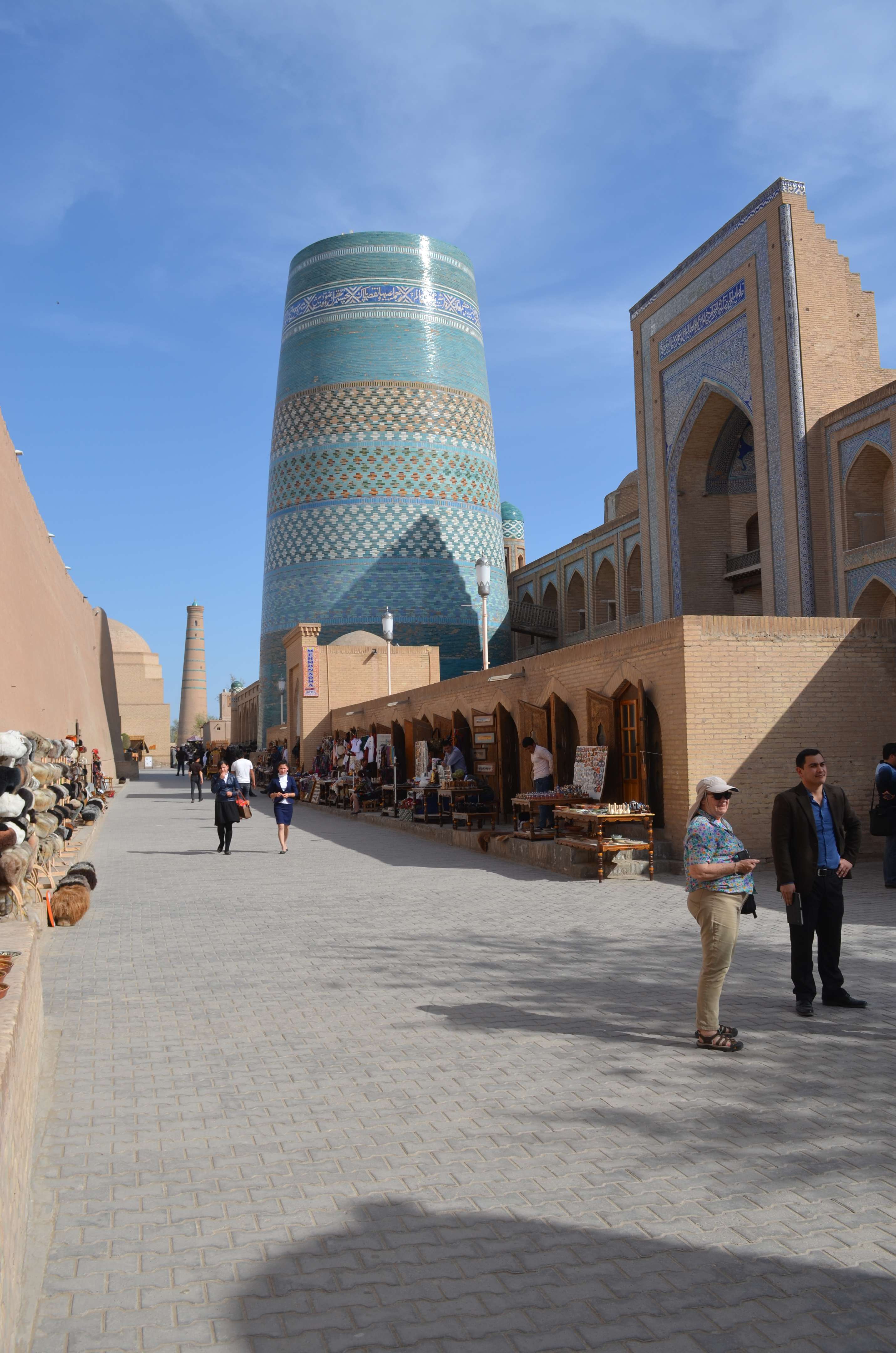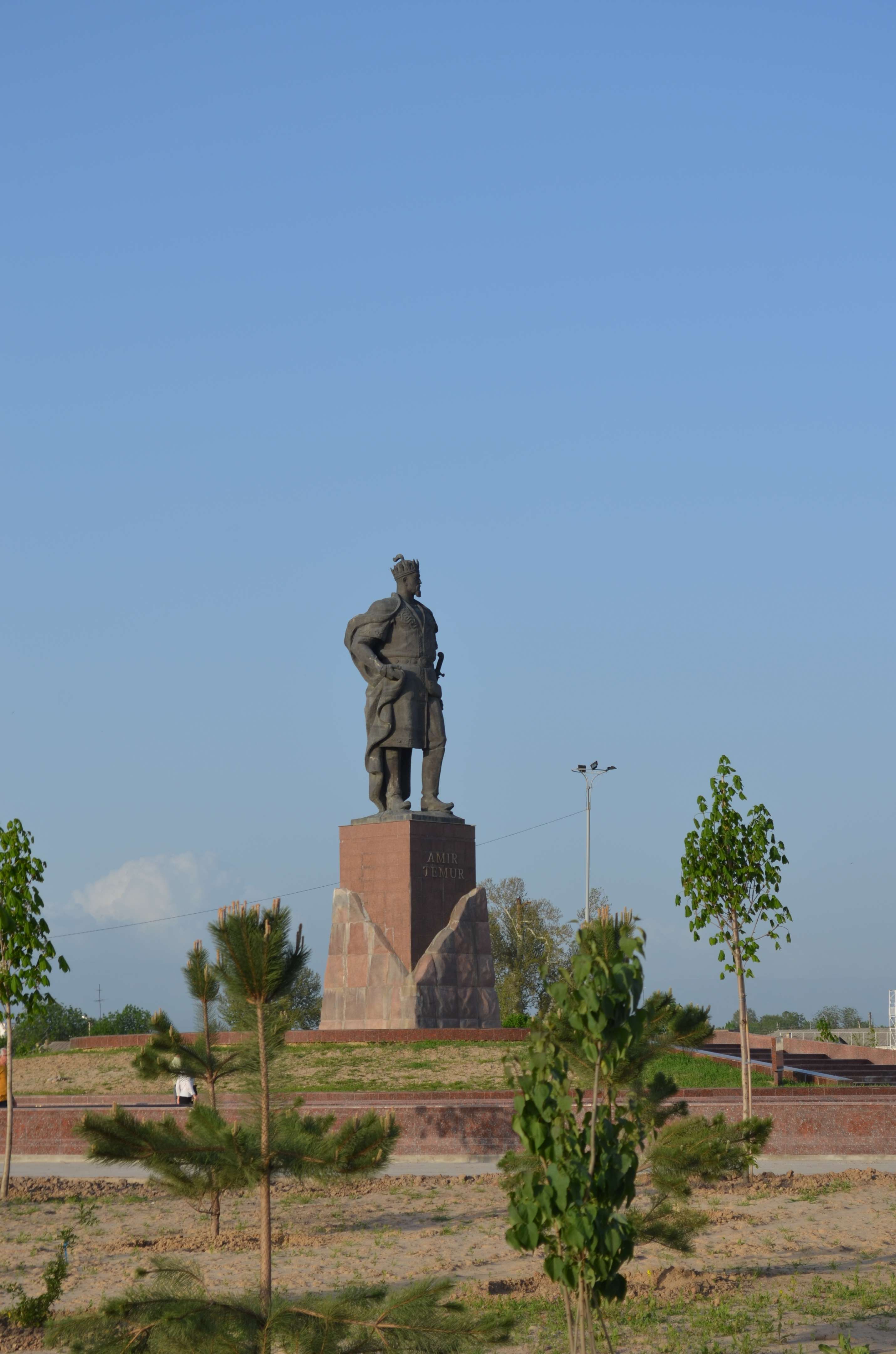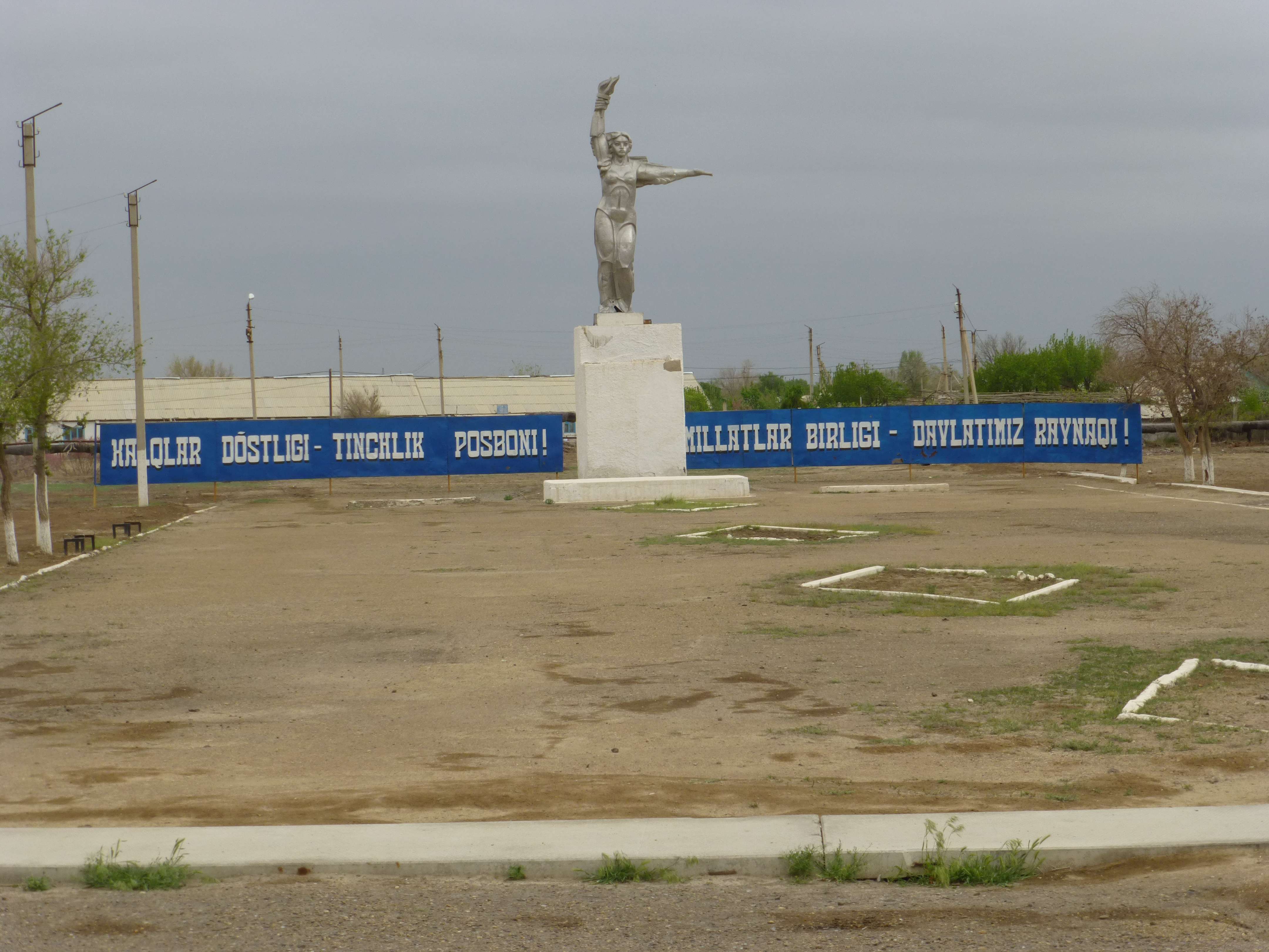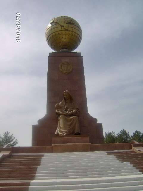 Visite sous un soleil de plomb, il fait près de 40°. Seuls dignes d’intérêt, le monument aux morts de la  « Guerre contre le fascisme » où sont gravés sur des plaques de cuivre le nom de tous ceux qui ne sont pas revenus, et la statue de la mère triste (la mère du soldat inconnu..) au pied de laquelle une flamme ne s’éteint jamais. Cette statue, qui avait un visage slave à l’époque soviétique, a été remplacée par un nouveau bronze qui arbore aujourd’hui des traits ouzbèks. De même, la statue de Lénine qui trônait au centre de l’esplanade a fait place à un globe terrestre mettant en valeur la carte du pays. A ses pieds, la statue de la mère heureuse, un nouveau né dans les bras.