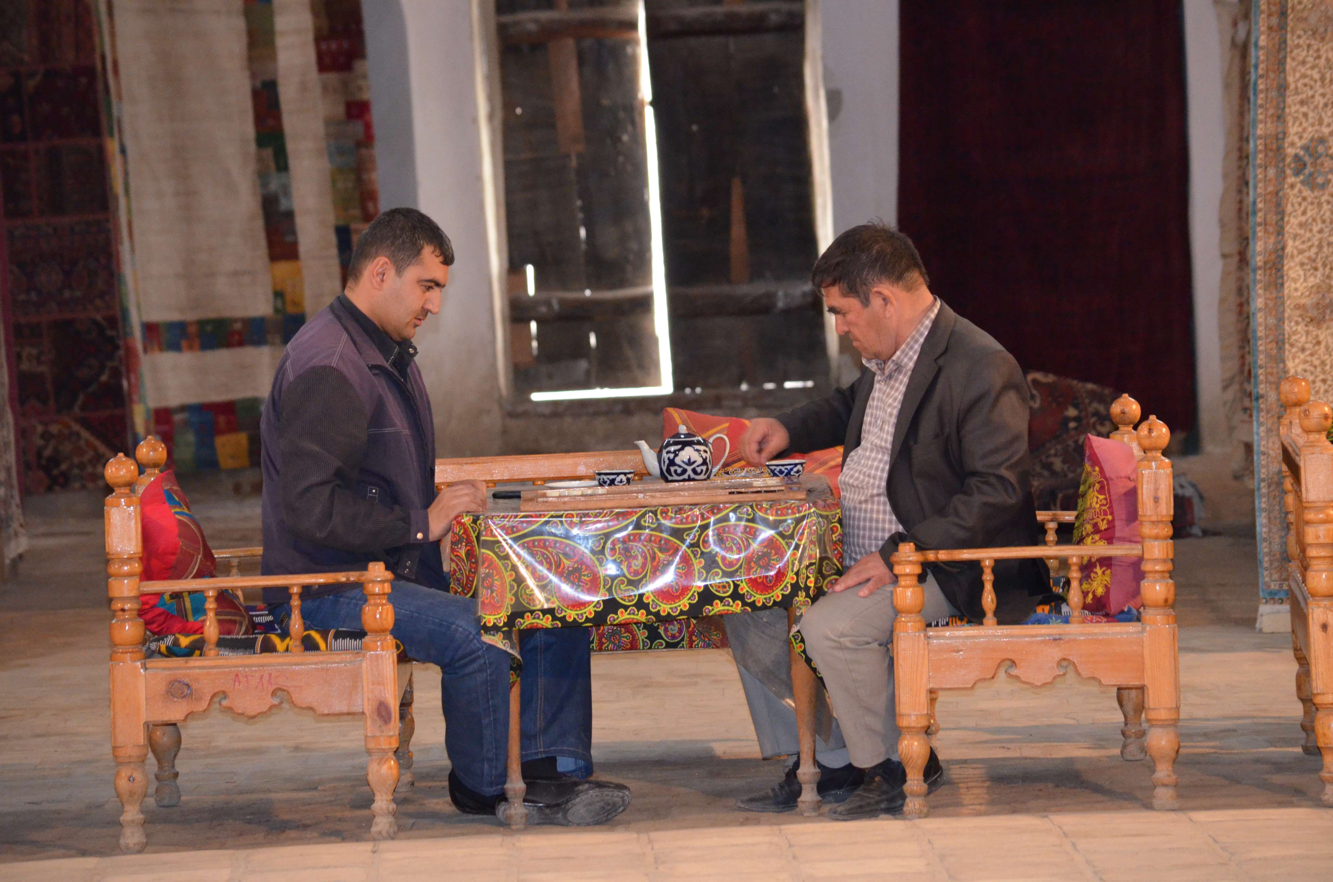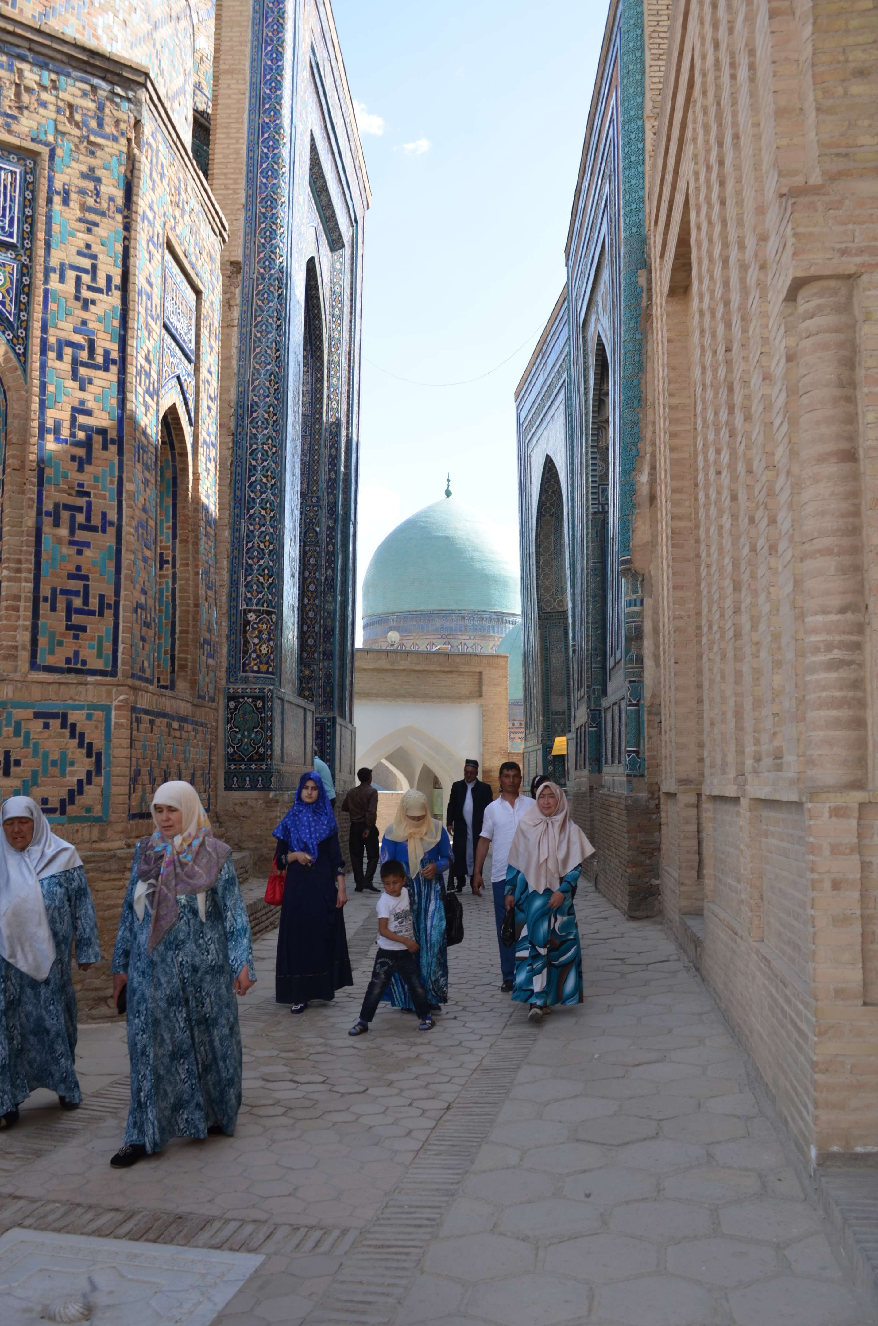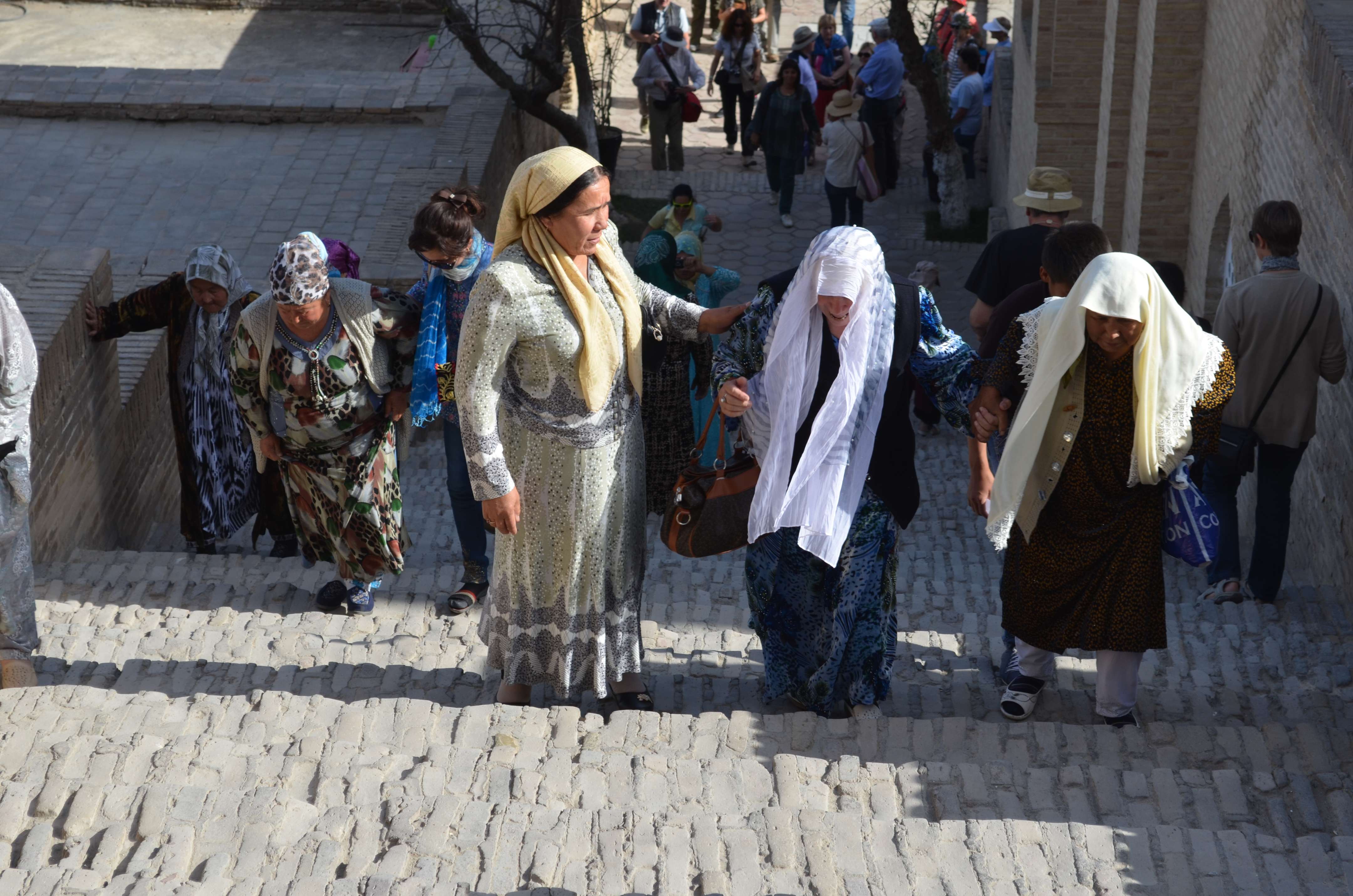 Dans ces sites historiques ou redevenus religieux, nous sommes toujours frappés par le nombre de visiteurs ouzbek. Les anciens portent la coiffe carrée noire caractéristique des régions d’origine turkmène, et les ainées des vêtements brodés de motifs de couleurs vives. Pour elles, le foulard est de rigueur. C’est aussi souvent le cas pour de plus jeunes qui les accompagnent, ce que nous n’avions pas noté plus au nord, dans les régions à dominante Tadjike.