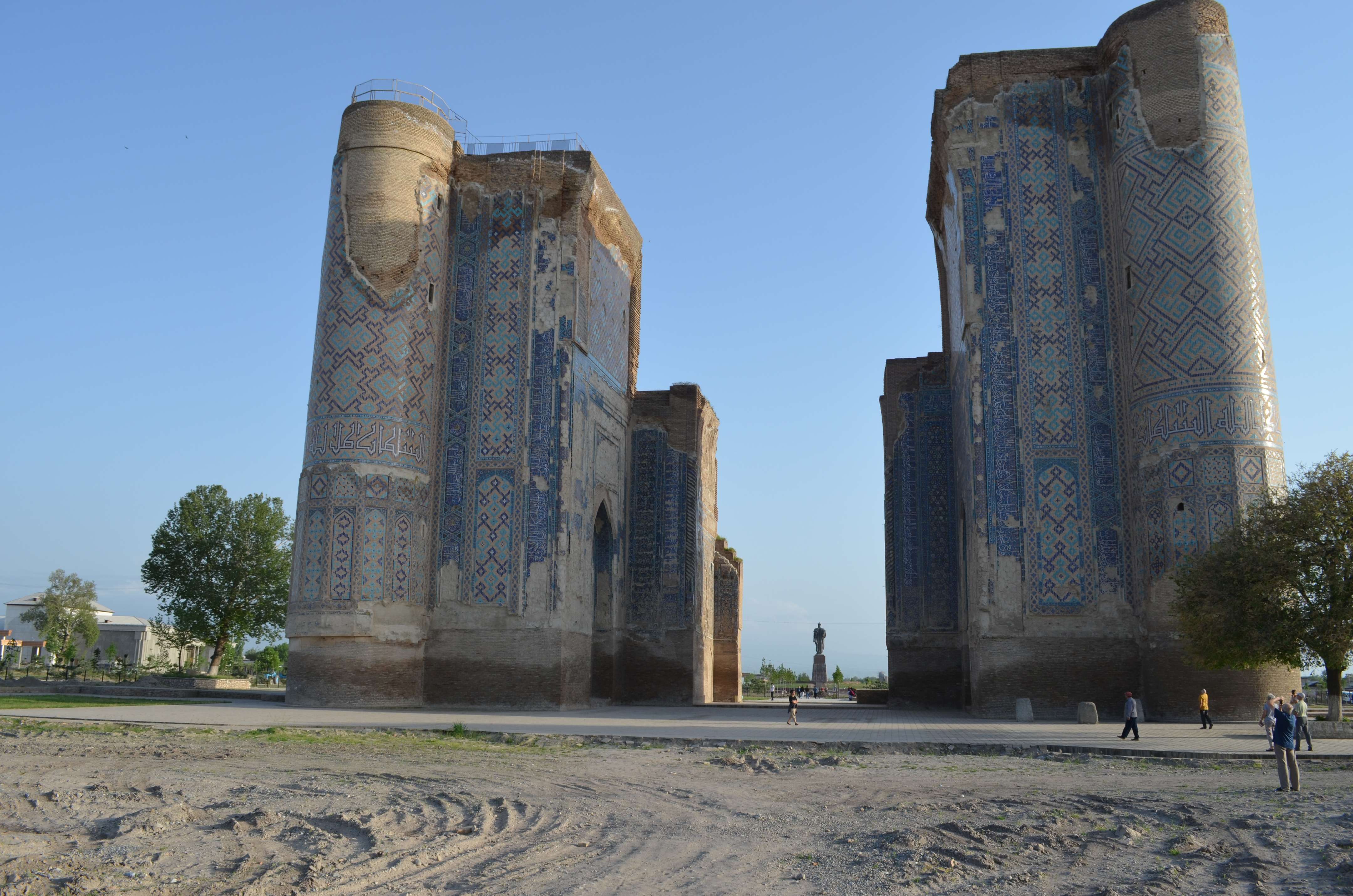 Ne subsistent aujourd’hui de ce palais que les portes monumentales, décorées de majoliques bleues, une mosquée et un mausolée, mais une partie de l’enceinte ainsi que l’emplacement du centre de l’édifice, symbolisé par une gigantesque statue du conquérant, en laissent imaginer les dimensions hors normes. C’est bien le Versailles Ouzbèk.