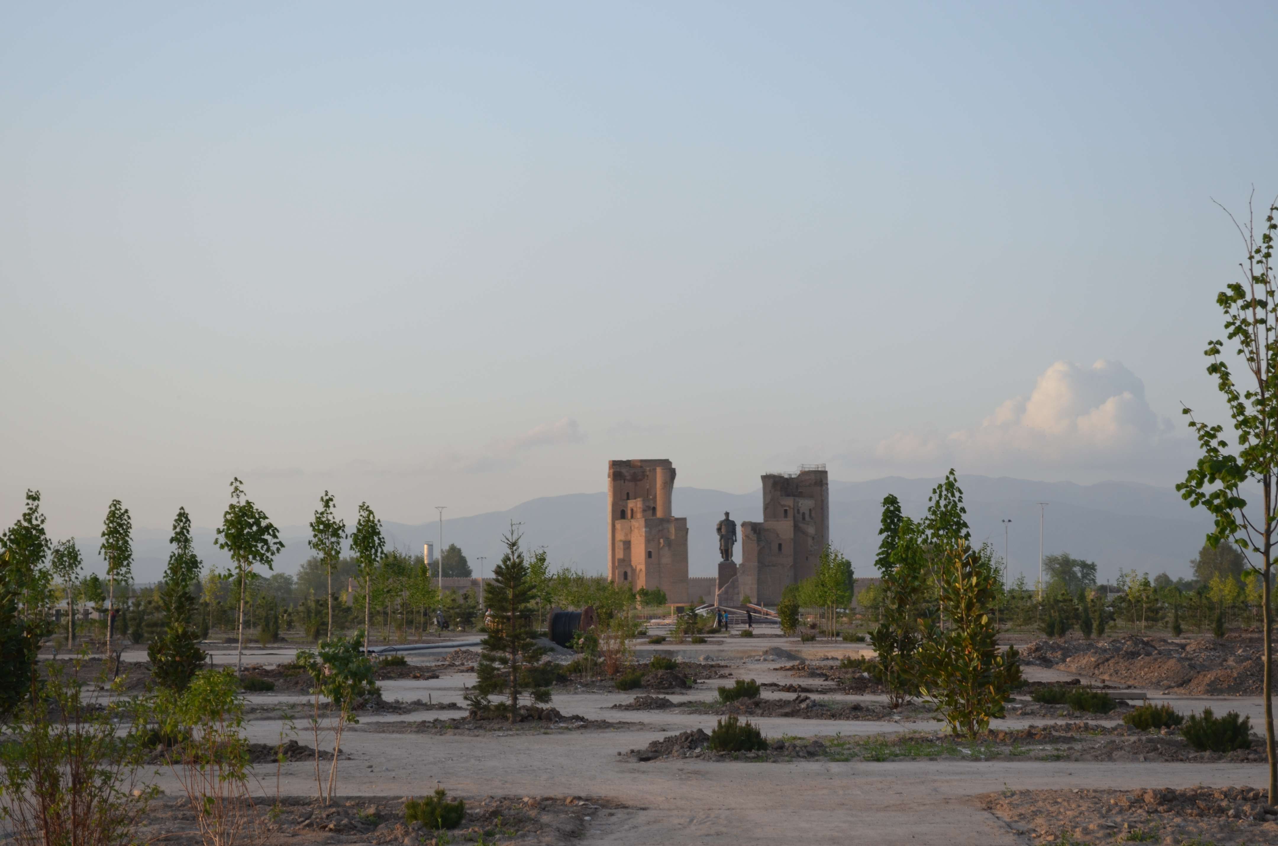 Nous atteindrons avec difficulté le point de bivouac prévu, la  zone étant un vaste chantier. On a manifestement entrepris d’y  réaliser un grandiose parc mettant en valeur les vestiges du palais Ak Saraï (Palais blanc) qu’y fit bâtir  Timour pendant 24 ans, à la fin du XIV° siècle.