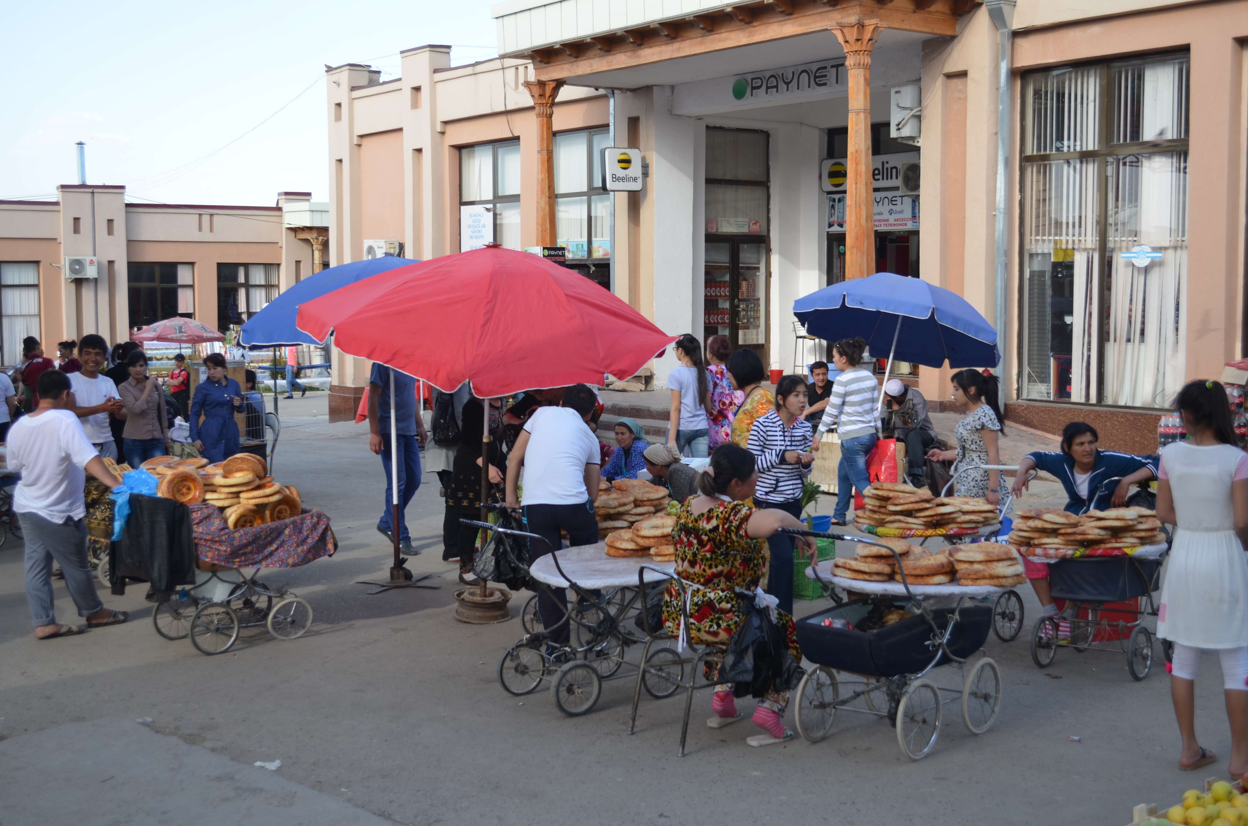 La ville ouzbèke se caractérise par des habitations beaucoup plus basses, encore en pisé , à l’exception du  marché Chorzu  aux nombreux pavillons, avec au centre une gigantesque coupole en dentelle de béton abritant des centaines de stands fréquentés, grâce à la station de métro du même nom, par toute la ville. Les prix y sont plus intéressants que ceux du marché dit « russe » qui voisine notre parking, dans la ville moderne.