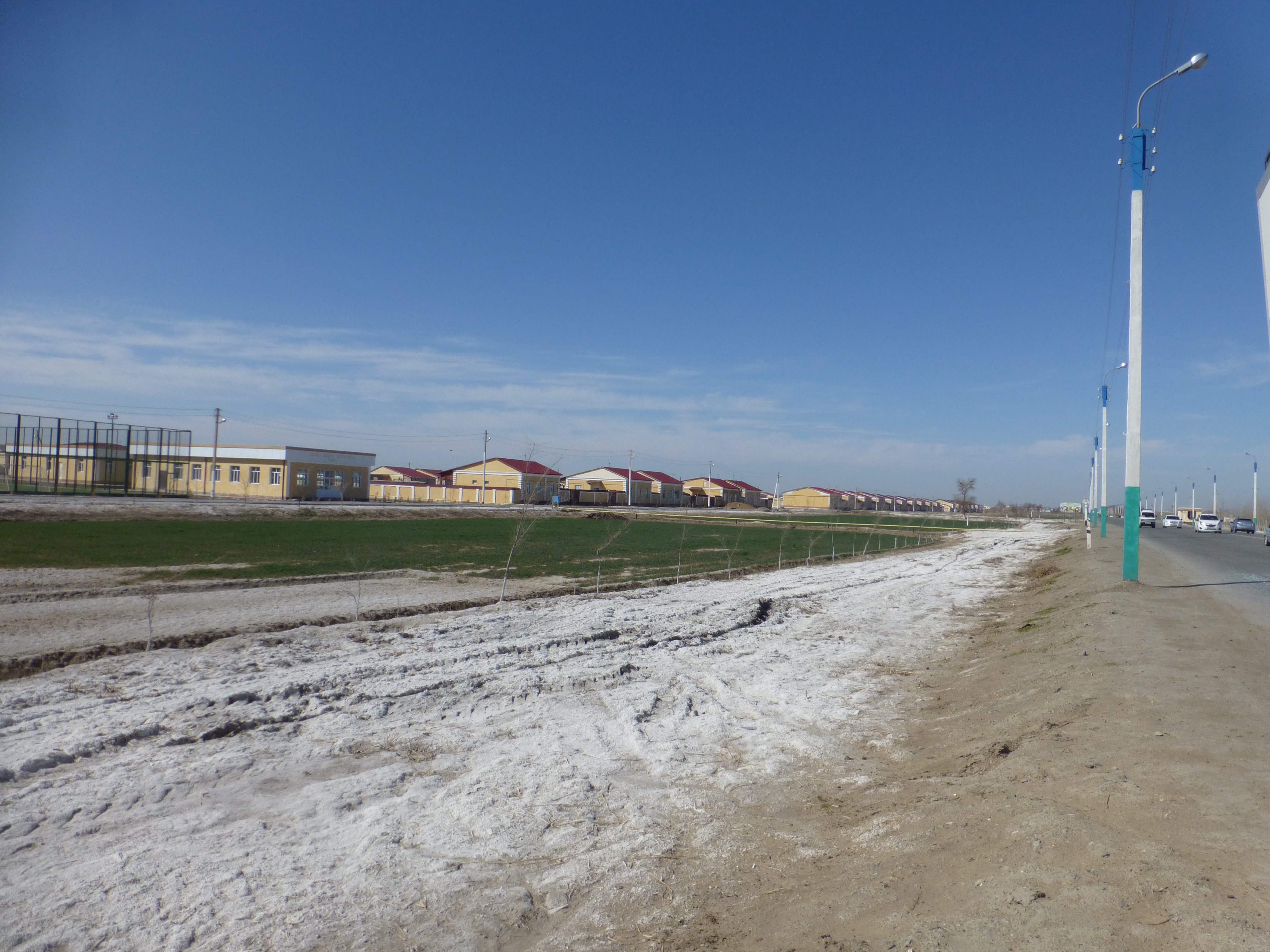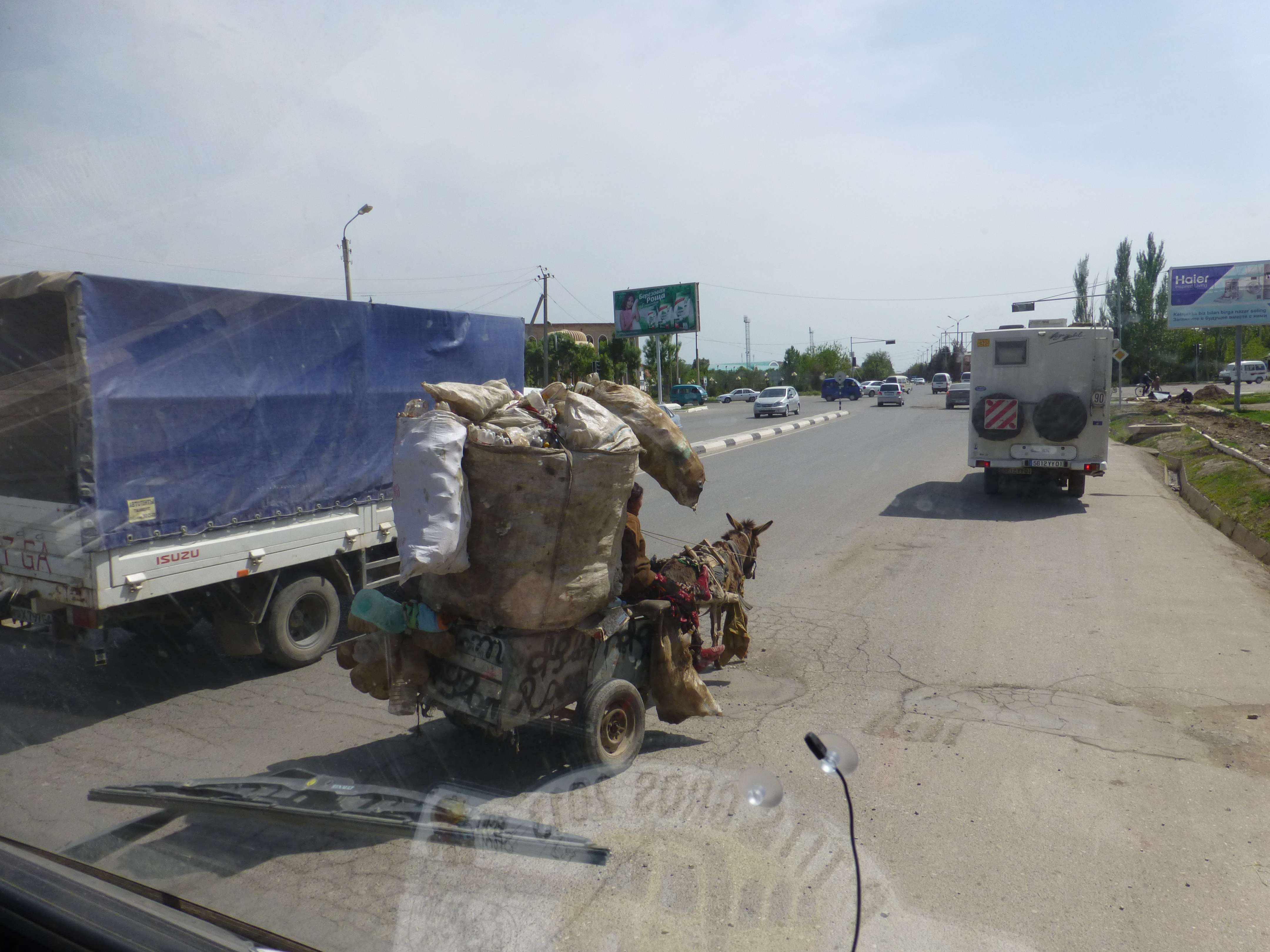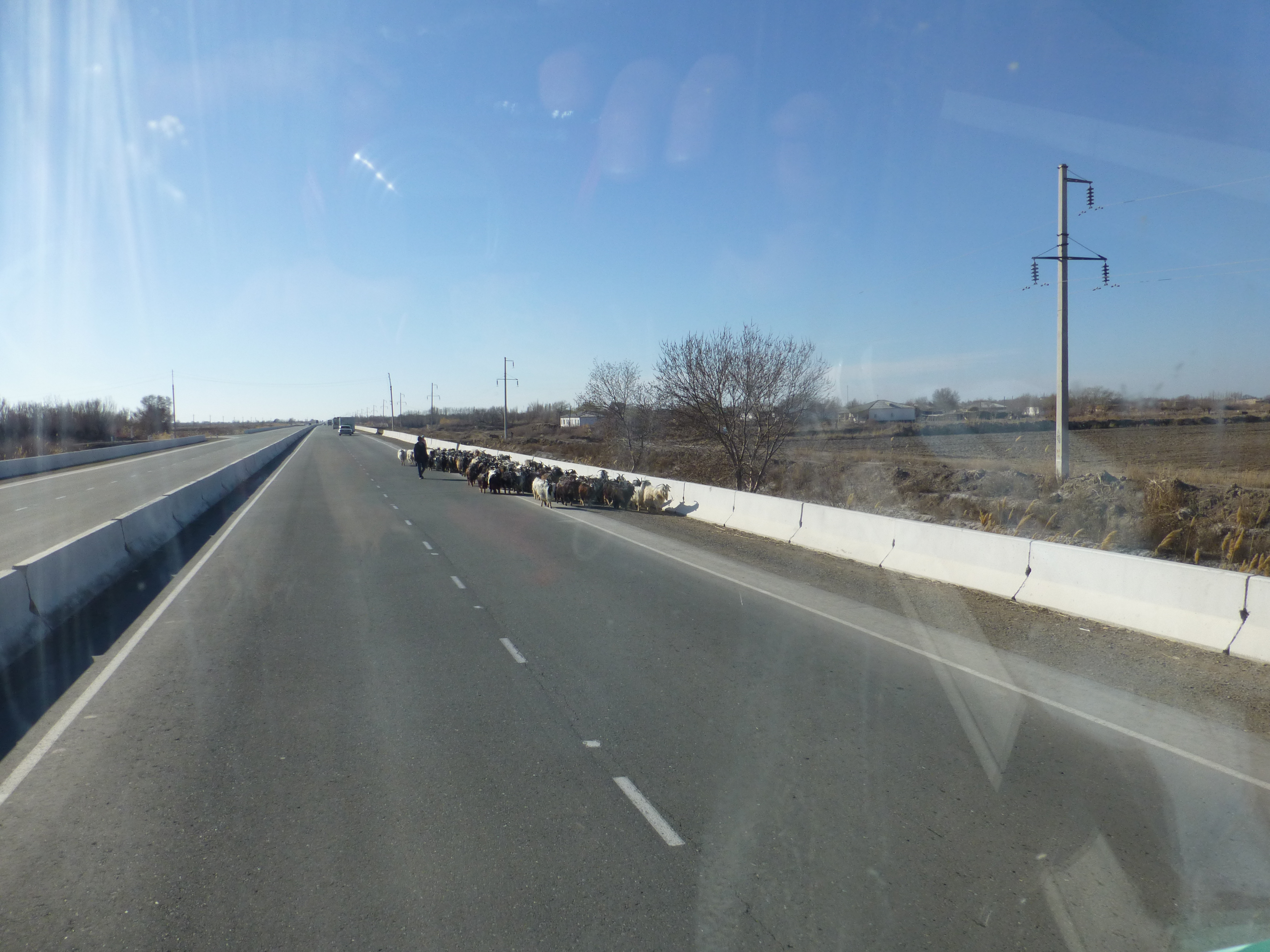Une route à 4 voies, de moyenne à bonne, dans une région de grandes cultures, avec une forte activité sur les bas côtés,  contourne le saillant du Kazaksthan. Par la voie la plus directe, il faudrait traverser deux frontières pour rejoindre Tachkent ! Staline, encore lui, a fait très fort dans son découpage de frontières, pour exacerber les dissensions nationales.