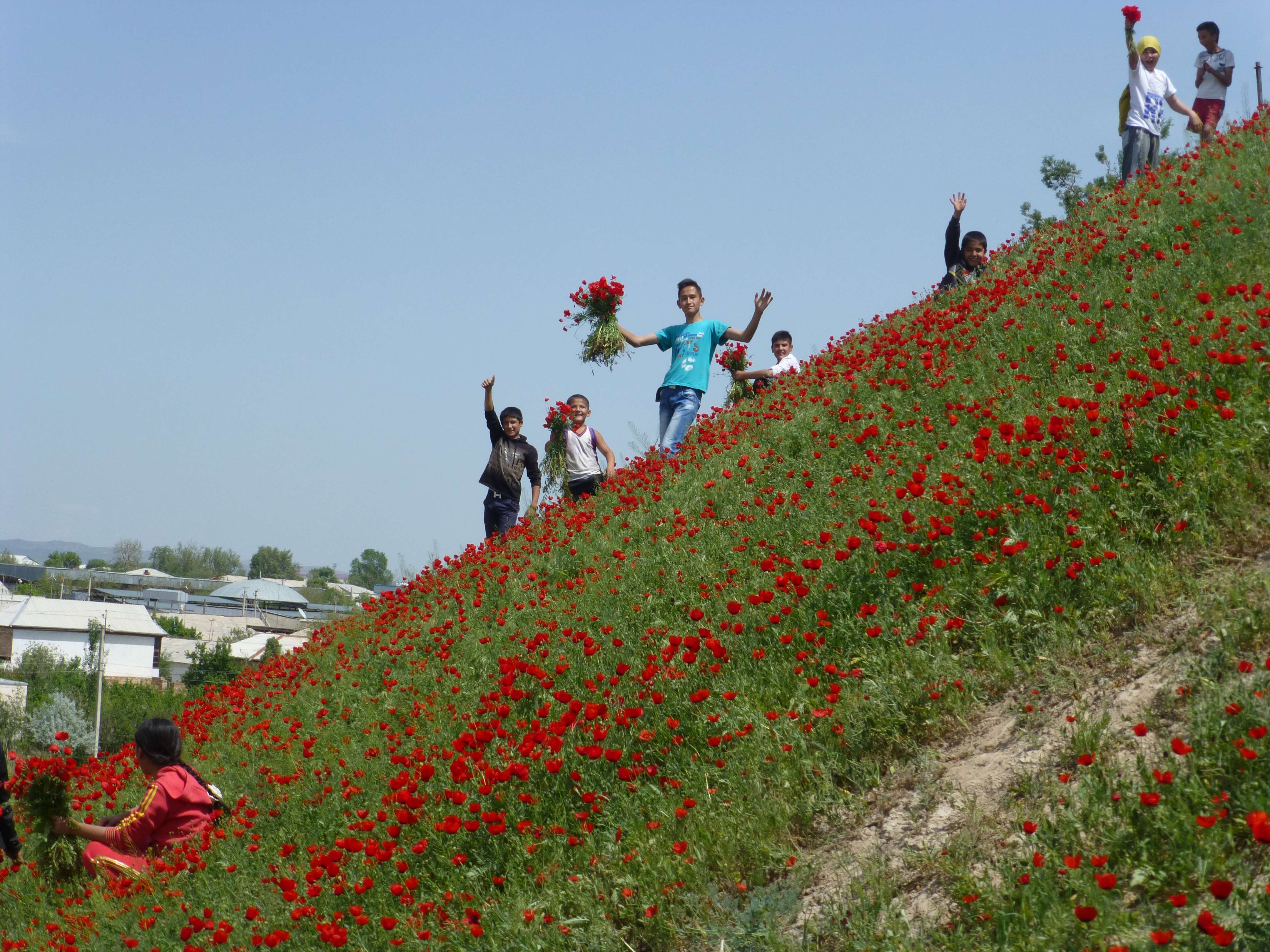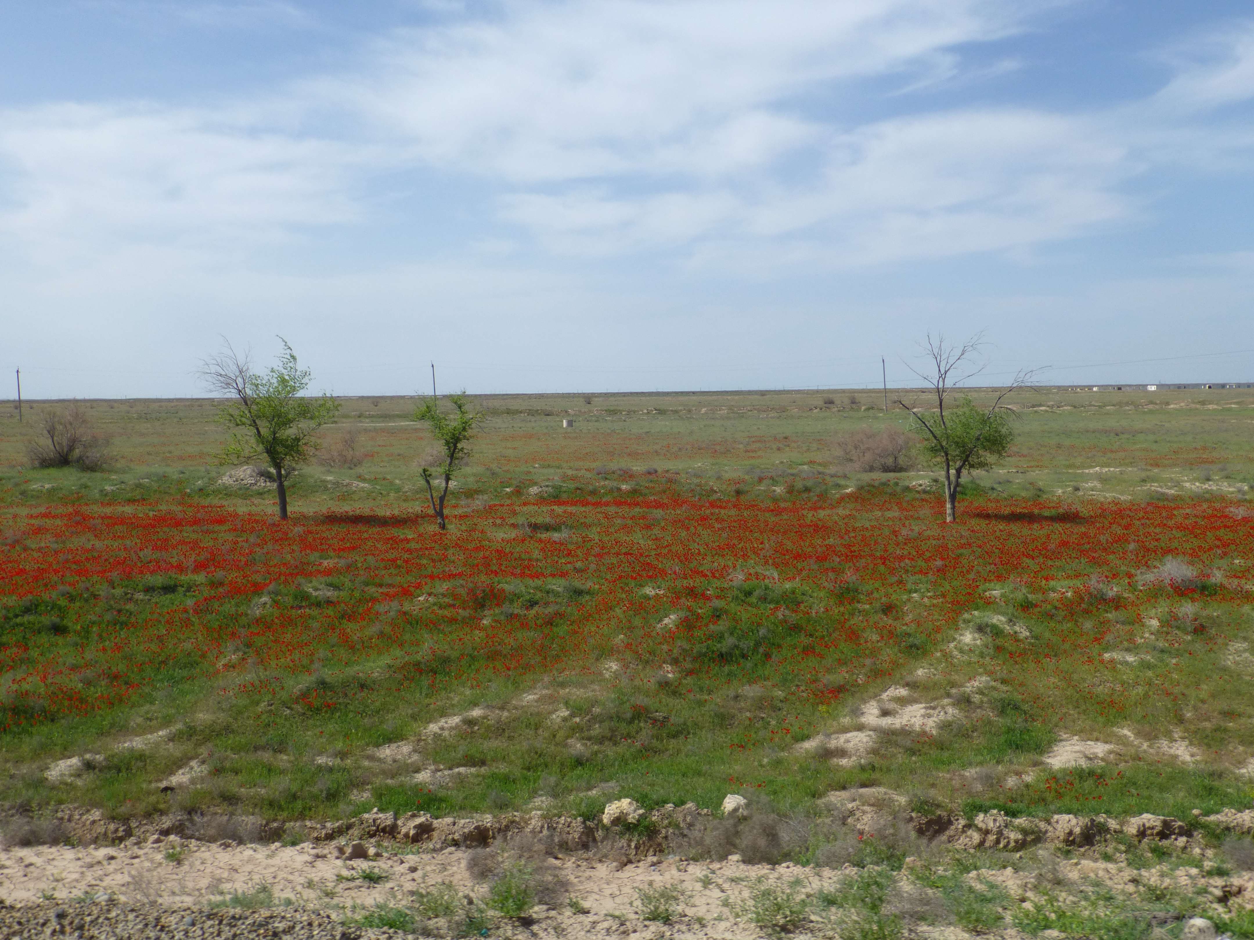 Direction sud est vers Qarshi, que nous atteindrons pour déjeuner après 170km de mauvaise route. A l’approche de la ville le paysage désertique change progressivement et nous traversons une steppe verdissante où apparaissent les premières nappes rouges de coquelicots.