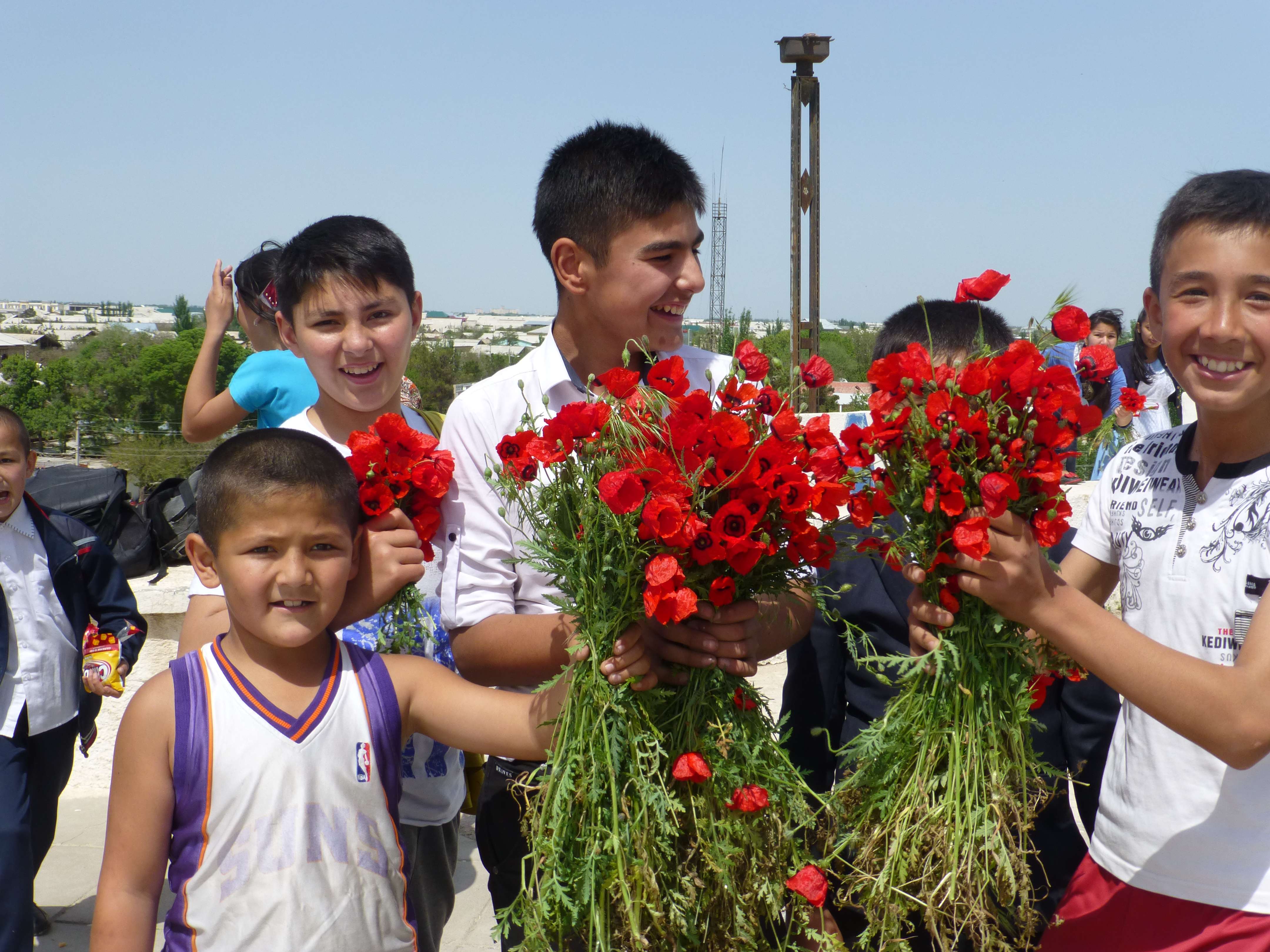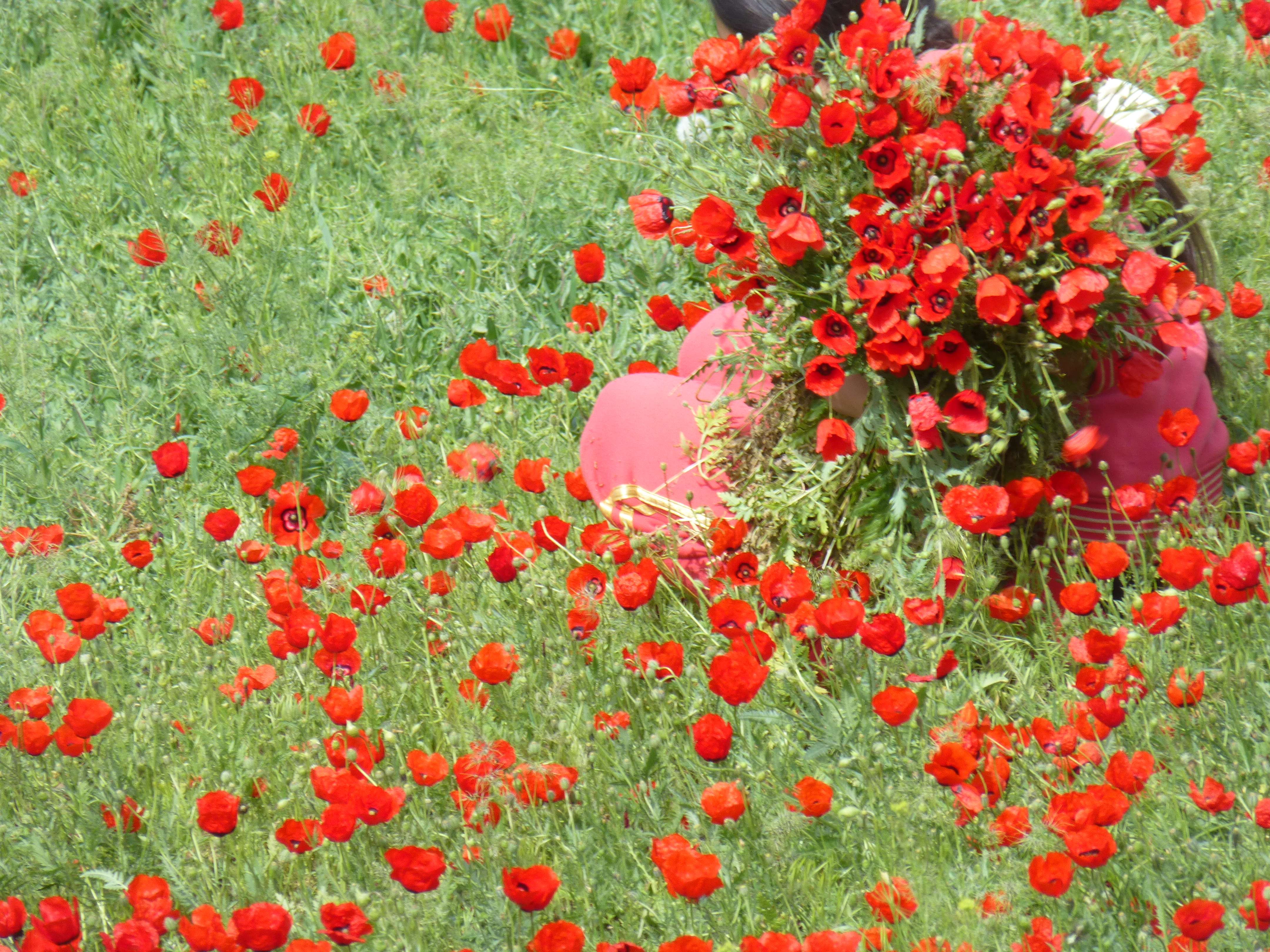 Pause  près d’un monument aux morts  pompeux avec ses vitraux à la gloire des soldats tombés pour la patrie, aujourd’hui très négligé ; l’étoile soviétique qui en couronnait la flèche a été démontée, ne subsiste que le croissant islamique. En escaladant le tumulus, nous  assisterons à la cueillette des coquelicots, qui sera suivie de la séance de pose devenue une habitude lors de tout contact avec les habitants. Nous n’avons jamais été autant photographiés !