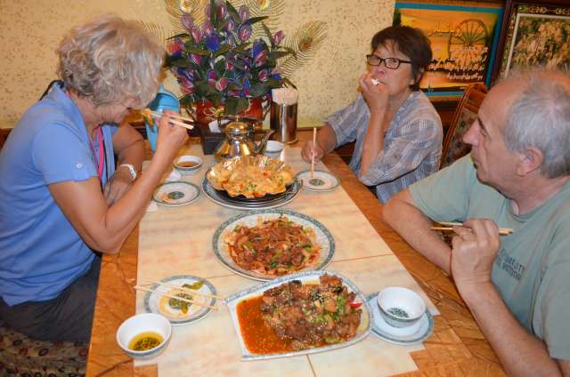 Petite promenade et resto pour la phase immersion. Il est 22h, les familles arrivent pour dîner et c’est le coup de feu dans la salle où on nous accueille aimablement, et où le choix des plats se fait sur photos. Petit problème de communication, les plats sont prévus pour plusieurs personnes, et nous en avons commandés 3 pour 4 ! Nous en viendrons malgré tout à bout tellement nous les apprécierons (Tofu sauté, nouilles sautées et ragout de bœuf). Il fait encore très chaud, près de 30° et les épices contribuent à l’empourprement des visages…