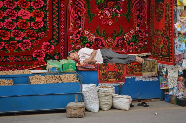 - Nous sommes dans le Xinjiang, région autonome Ouighoure où les Hans, l’ethnie dominante en Chine, sont ici minoritaires. De fait, sur le type physique, rien ne permet de penser que nous sommes en Chine, tout nous rappelle les pays que nous venons de traverser.