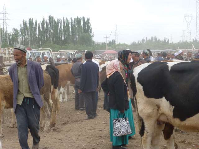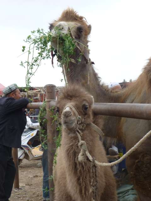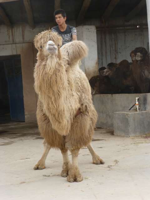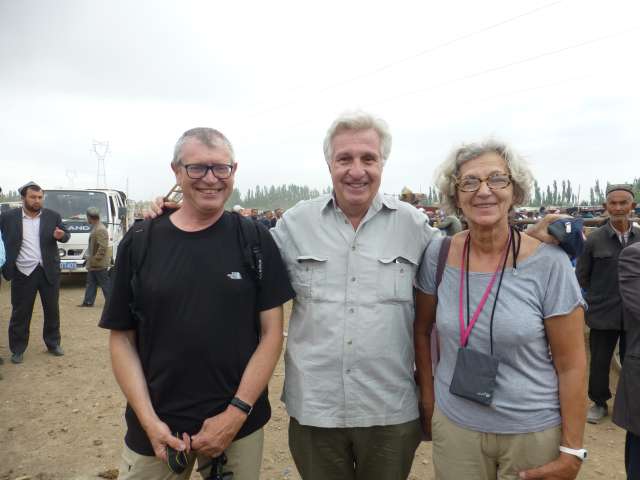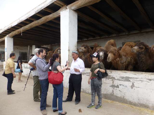 Nous serons abordés par une jeune femme, micro en main, attirée par nos échanges en français : Il s’agit de la productrice qui accompagne Alain de Chalvron, correspondant permanent de France Télévision à Pékin, qui réalise une série sur la Route de la Soie. Présentations de l’équipe, du consul de Kashgar, du directeur du marché, échanges chaleureux avec Alain de Chalvron sur ses activités et les risques du métier (sa couverture de Fukushima !!) et sur notre voyage. Le cadreur, français basé en Chine depuis 13 ans nous transmet une invitation à déjeuner du consul, après la visite « privée » du parc à chameaux, fermé celui là, où sont gardées les bêtes les plus racées. Certaines peuvent atteindre 12000 €, le prix d’un animal commun étant de l’ordre de 400 €.