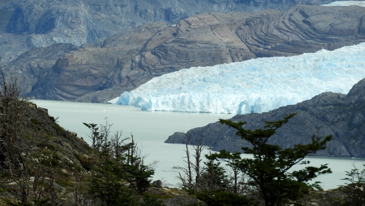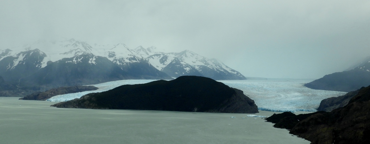 Le catamaran de 9h est bourré, les premiers se précipitent sur la passerelle pour bénéficier de la vue. 35 mn de traversée pour arriver au Refuge Paine Grande, belle réalisation qui tient plus du centre de vacances que du refuge. Son camping est complet et des dizaines de randonneurs, après avoir été briefés par des rangers très vigilants, entament le circuit qui, en 3 à 5 jours, leur permettra d’effectuer le tour du massif. Nous nous contenterons de la première étape vers le refuge Lago Grey puis vers le mirador du même nom, à 12km quand même, en grimpant le long du lac.