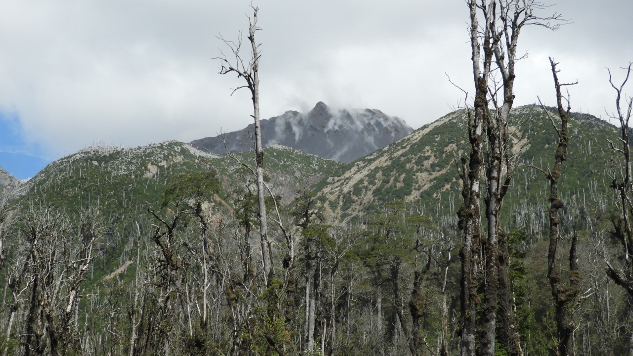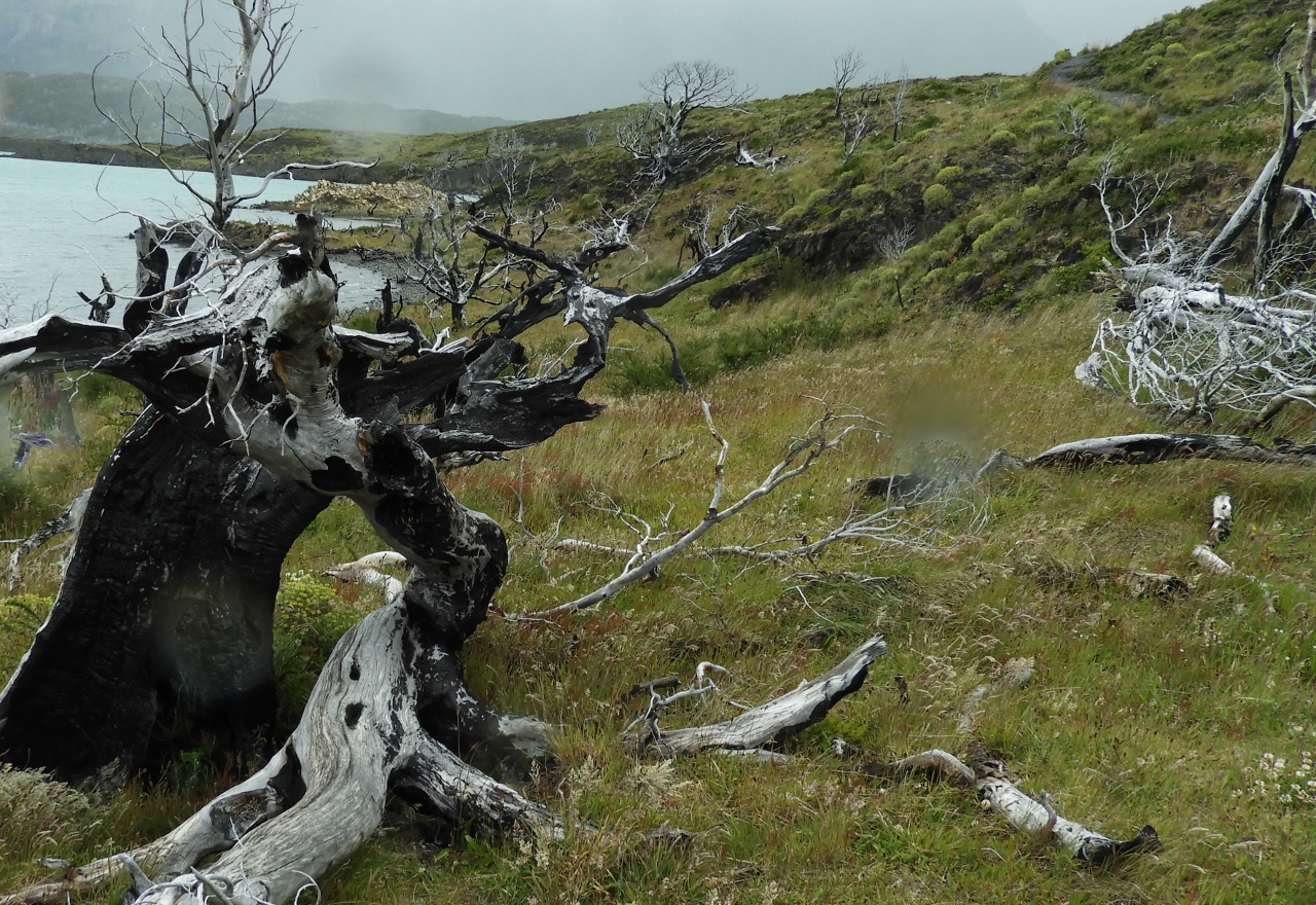 Vent de folie et pluie toute la nuit, nous avons été secoués comme dans un shaker. Au matin, ciel bouché. Il n’y aura pas débat et la décision fut vite prise : on reste sous la couette. L’après midi, il faut quand même bouger et nous entamons une randonnée dans le vent pour aller jusqu’à Mirador Cuernos. Passée la cascade, on décide de faire demi-tour au niveau du col, car le brouillard masque tout au-delà, nos pieds sont déjà mouillés et nous n’avons pas 50 paires de chaussures. Nous aurons quand même eu le temps de constater les ravages causés par l’incendie qui dévasta une grande partie du parc il y a quelques années, suite à l’inconscience d’un visiteur ,et qui justifient la vigilance constante manifestée par les rangers.