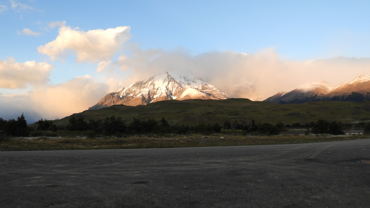 Temps très doux dès le matin. La route après Cerro Castillo, bourg qui se limite à 5 maisons à un carrefour, est en mauvais état. Le point positif est que l’on fait des travaux d’entretien, le point négatif est qu’on se tape les travaux, et une déviation, qui nous fait rentrer au parc par l’est, à la Porteria laguna Amarga, et non par le sud, après avoir longé le lac Sarmiento.