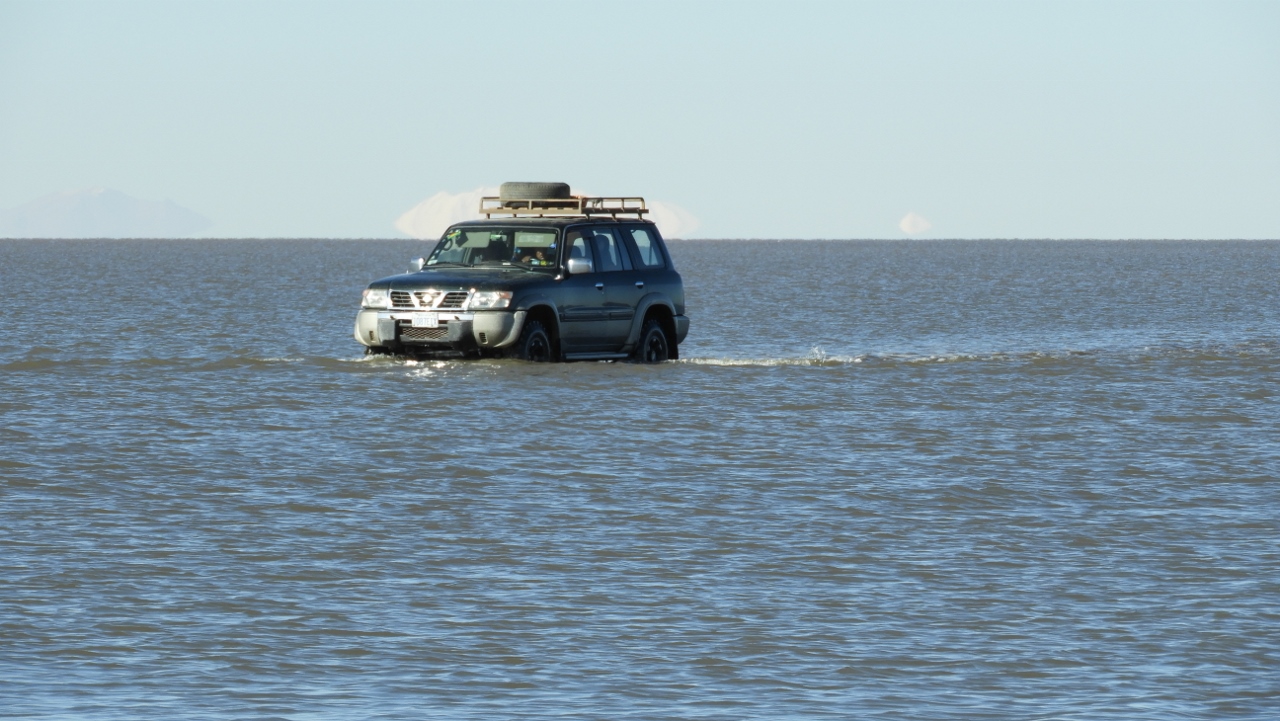 La saison sèche est terminée. Impossible d’aller à Isla de Incahuasi, au centre de la saline. Seuls quelques 4×4 d’agence, dont les chauffeurs sont capables de repérer la chaussée sous l’eau, traversent.