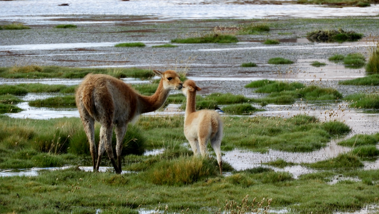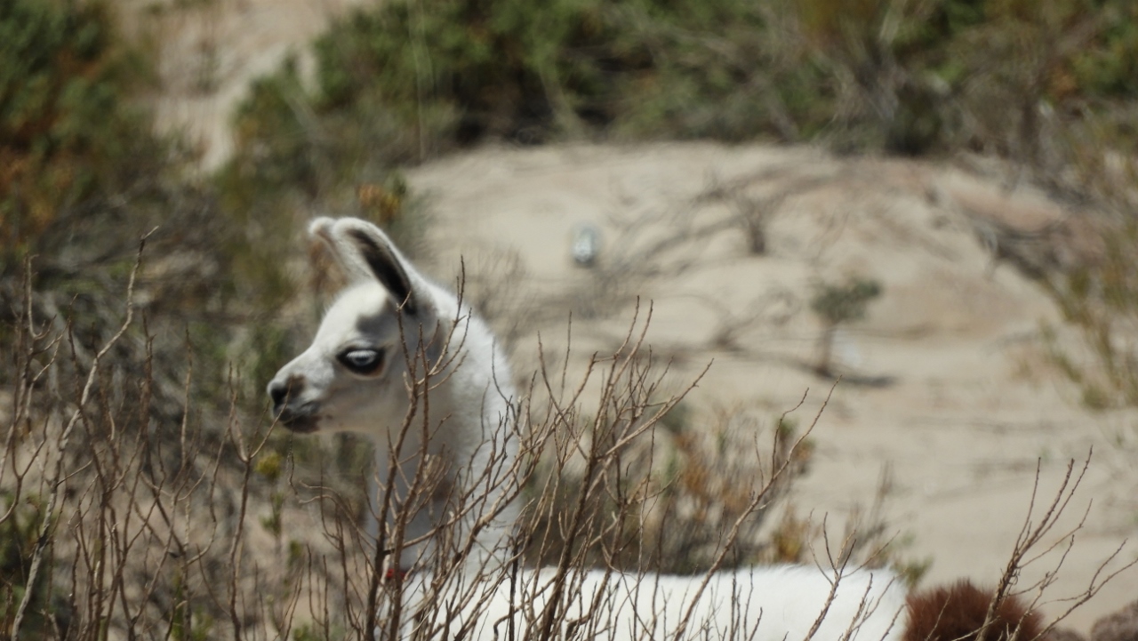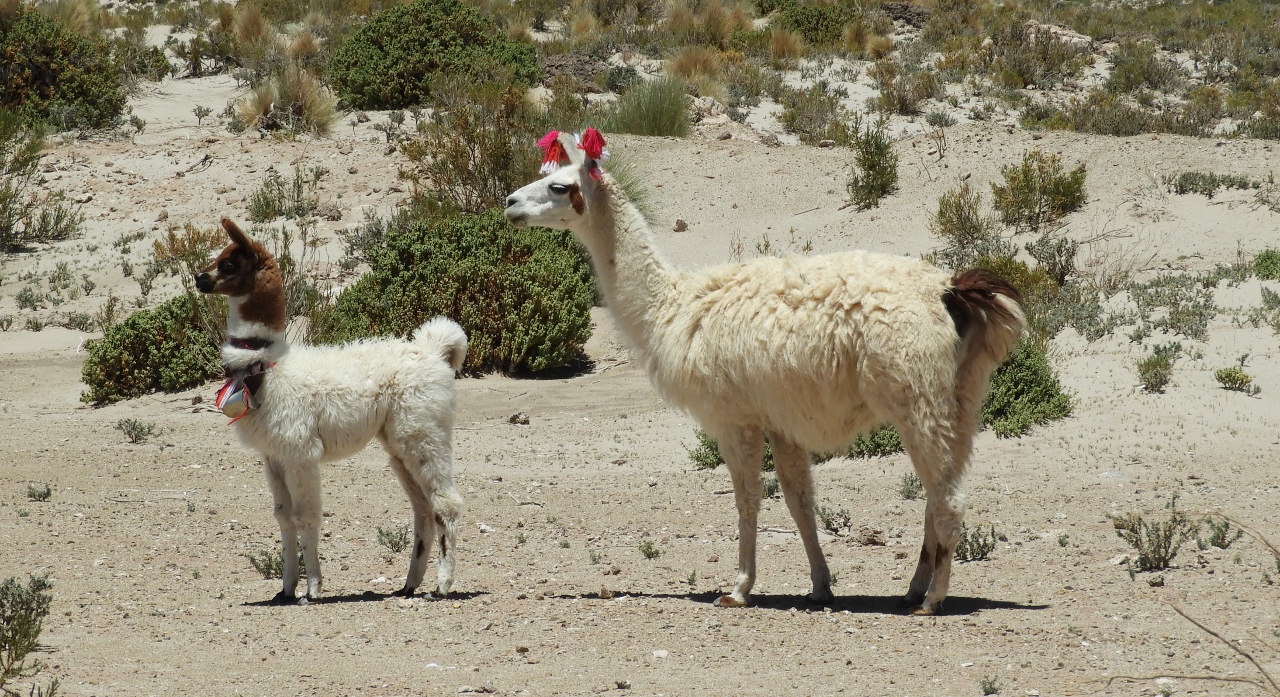 La route N°5 qui contourne le salar par le sud est un peu éprouvante, vu les trous, mais parfois roulante, à 3800 m d’altitude, et nous donne le plaisir de nouveaux lamas et alpagas. Ils sont pas mimis, les petits alpagas ?