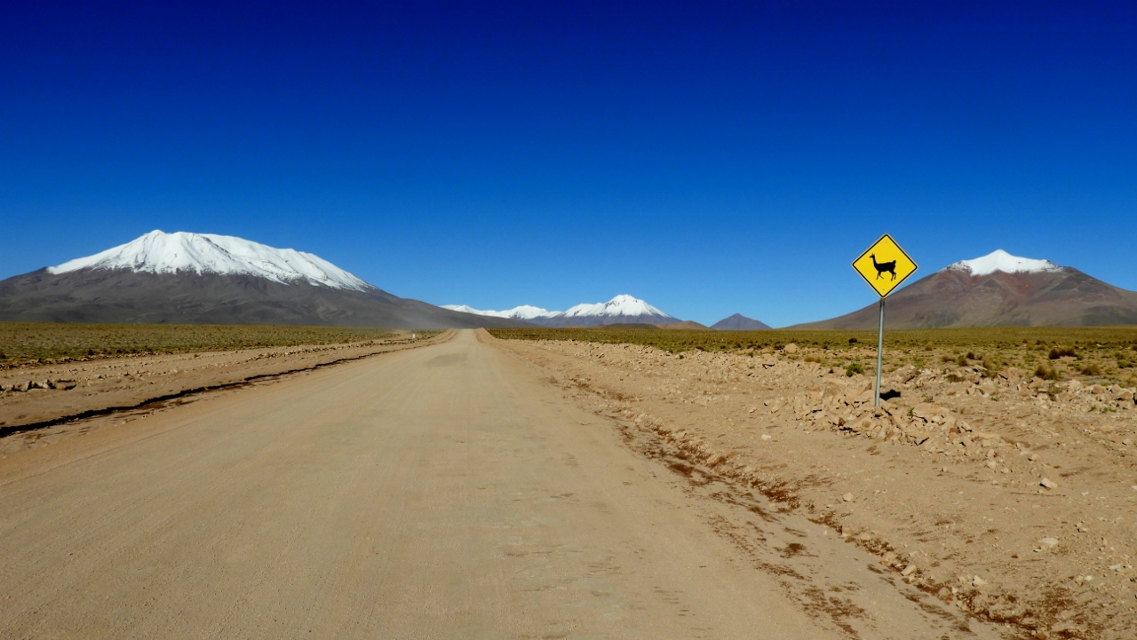 Route 9 vers le nord, superbe goudron sauf quelques zones à trous et une portion en travaux sur la fin. La route grimpe gentiment à 3500m, dans des paysages toujours fantastiques, puis un plateau immense où nous verrons nos premiers lamas, sans un virage sur 100km.