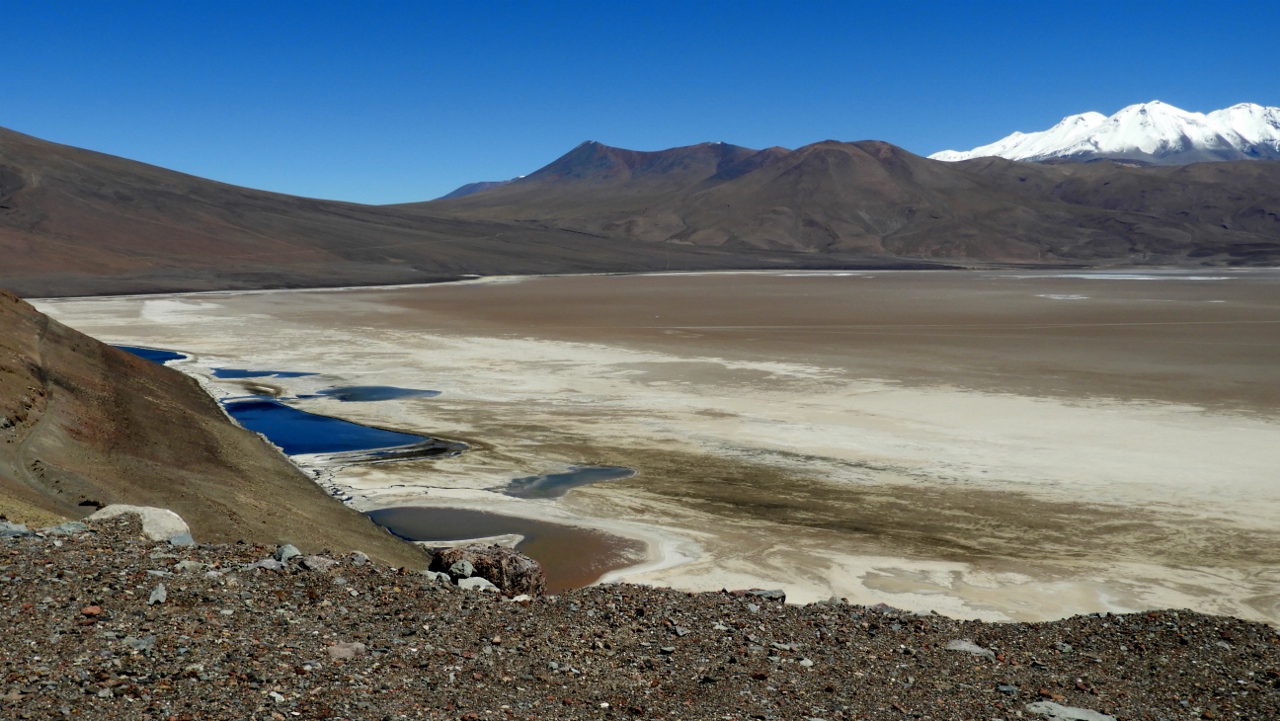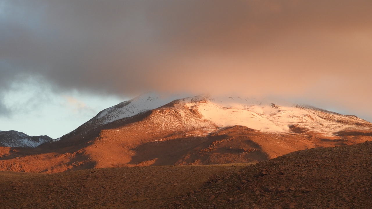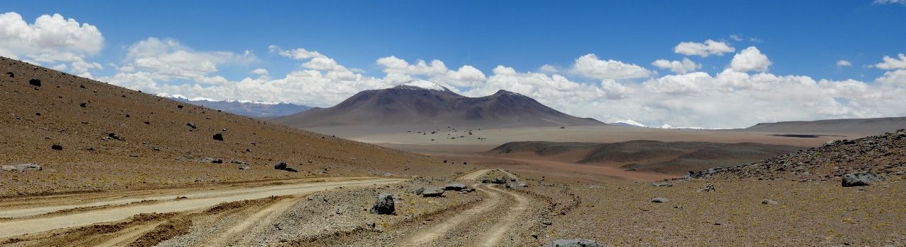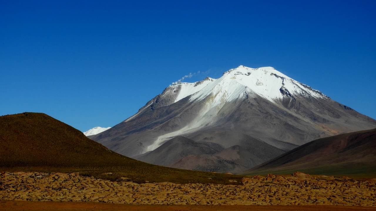 Nous passerons au pied du volcan Ollague, dont le cône est toujours orné d’un léger panache de vapeurs, et franchiront le dernier col à une cinquantaine de km de la frontière, à 4380m d’altitude
