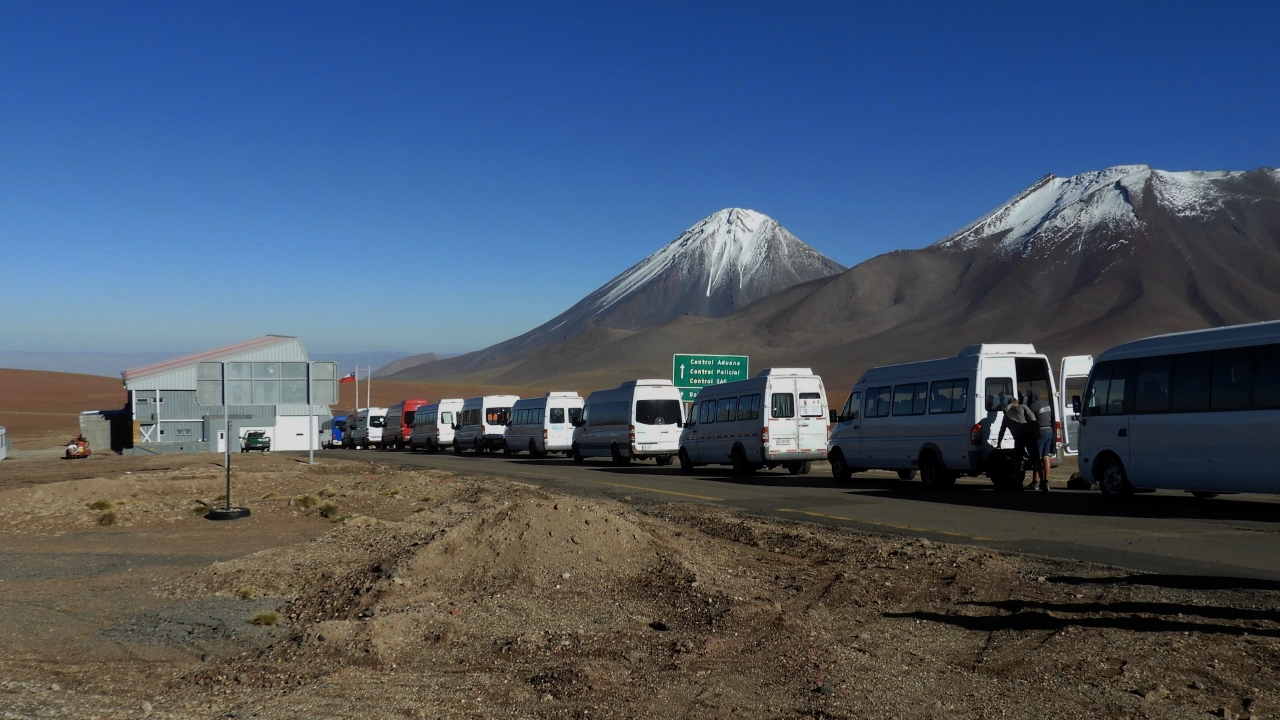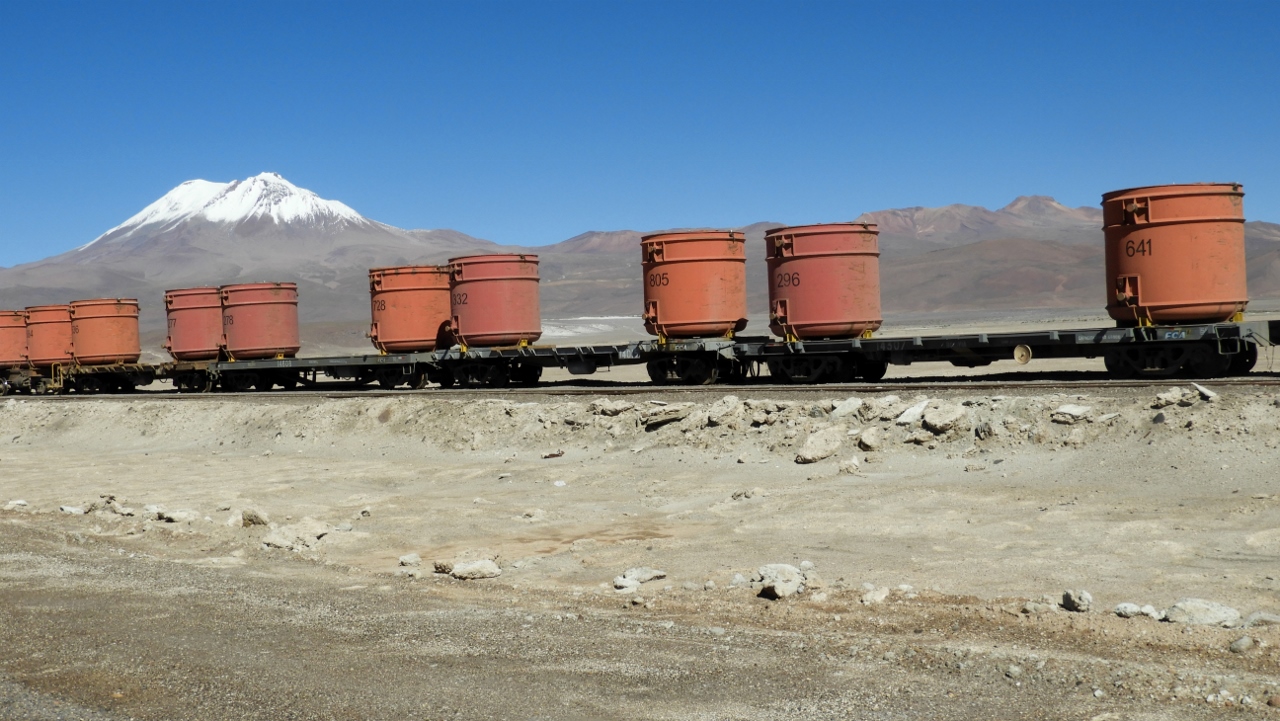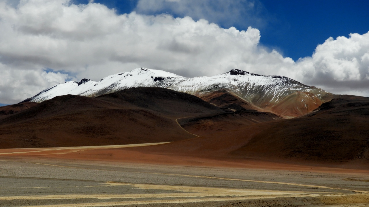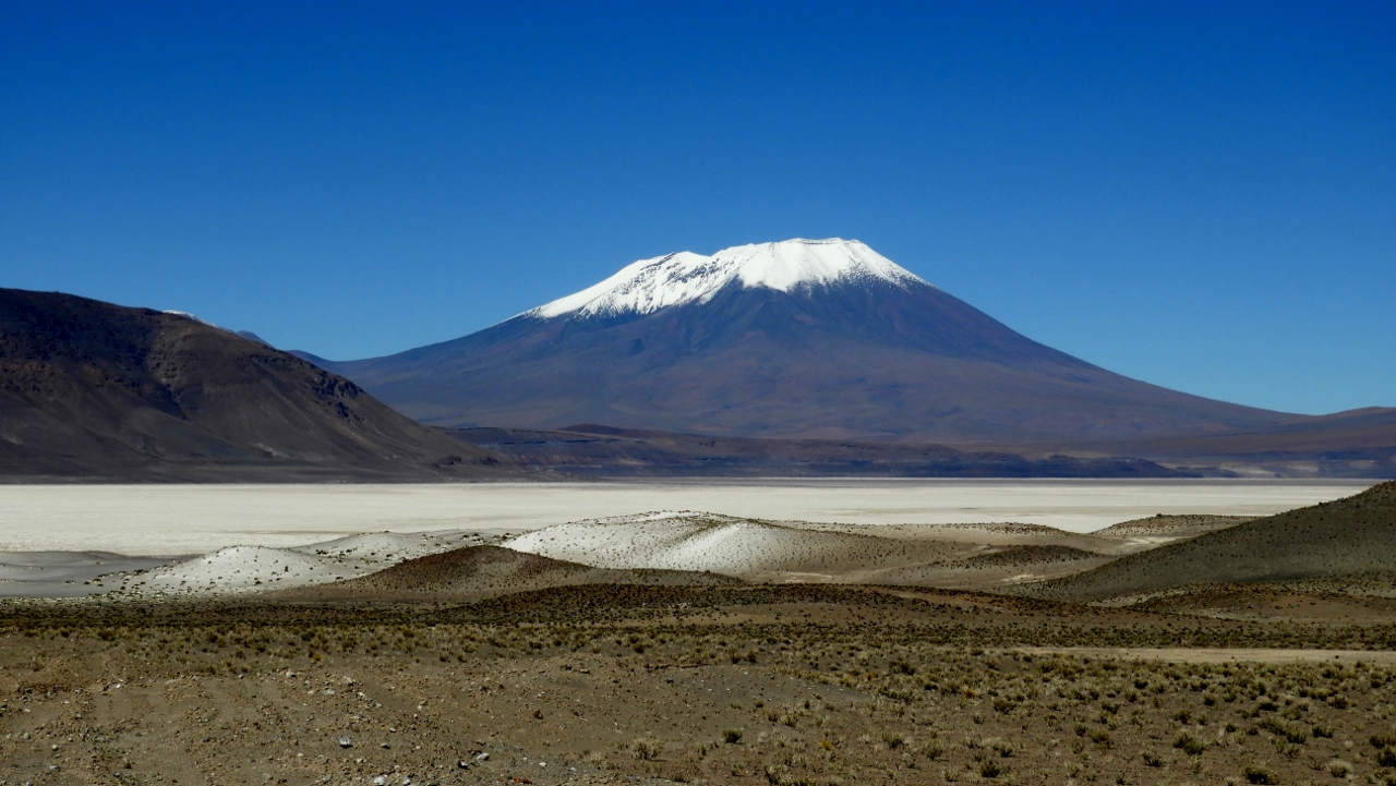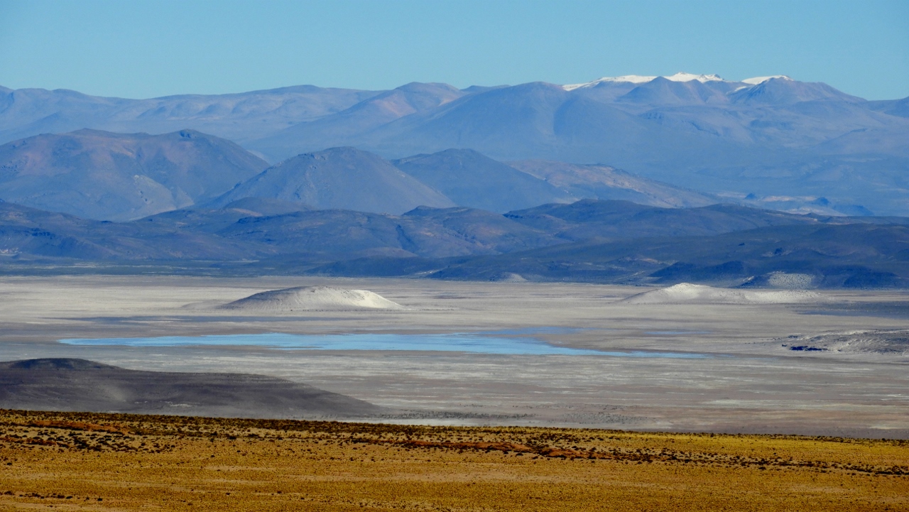 Bonne surprise, que nous attendions un peu, le Chili nous ayant habitué à cela, le goudron commence dès la frontière. C’est officiellement l’ autoroute 21, pour nous une belle départementale, qui nous fera traverser en piquent vers le sud ,des paysages superbes, désertiques, contournant le volcan Ollague et longeant les salars de Carcotte et de Acostan, et franchir le col Acostan à 4000m, où, au milieu de nulle part, un poste de police surveille le trafic devant une gare de marchandise endormie.