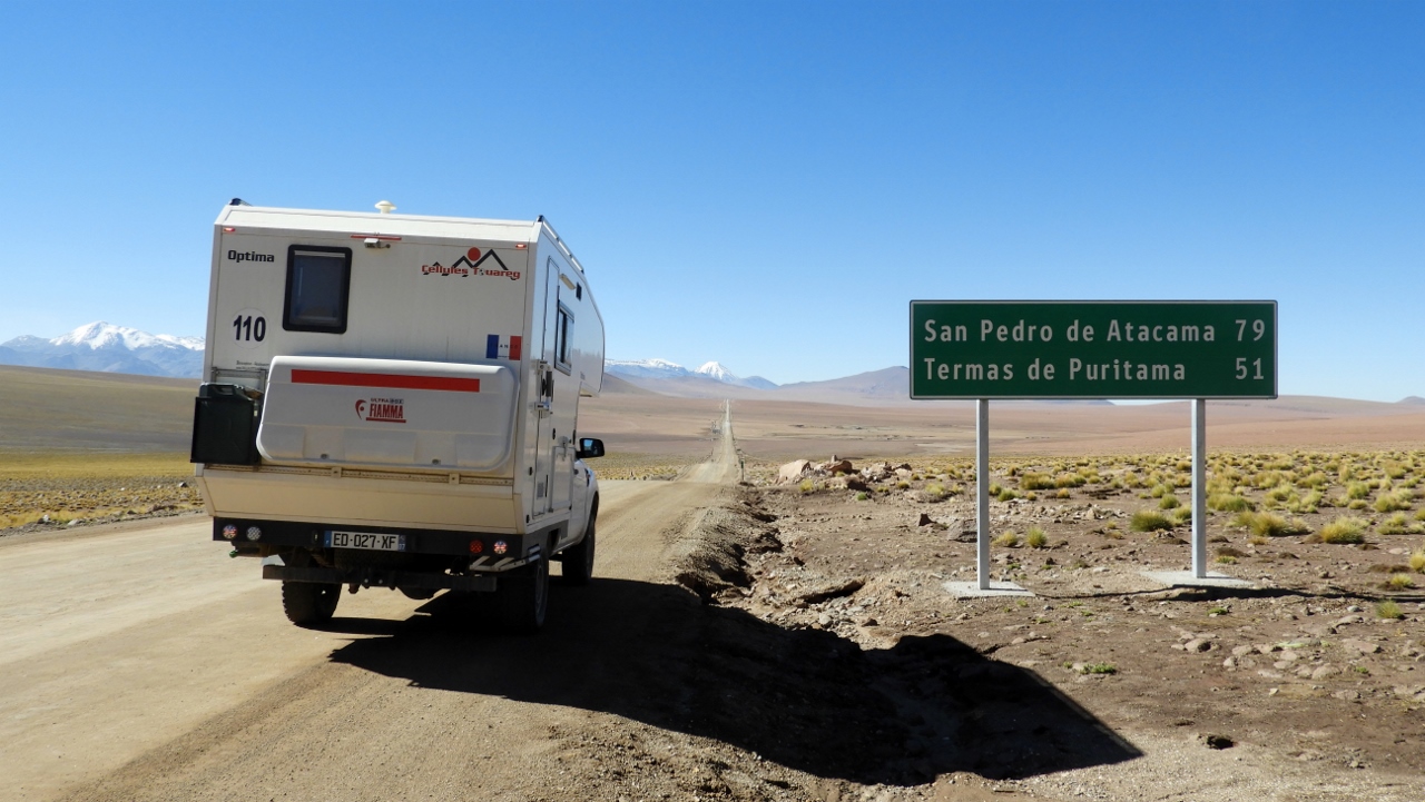 Au niveau de Conchi, un panneau nous indique la direction du Geyser El Tatio, que nous souhaitons aller voir, par la piste B145, plein est puis obliquant vers le sud. Ravis, on fonce, cela nous fera gagner près de 150km par rapport à l’itinéraire descendant jusqu’à San Pedro de Atacama, puis remontant vers le nord . Large piste, mais tellement pourrie de tôle ondulée qu’on fait demi tour au bout de 4km, le geyser est en effet encore à100km, et même avec un 4×4, la tôle, c’est seulement à petite dose, ou quand on ne peut faire autrement.