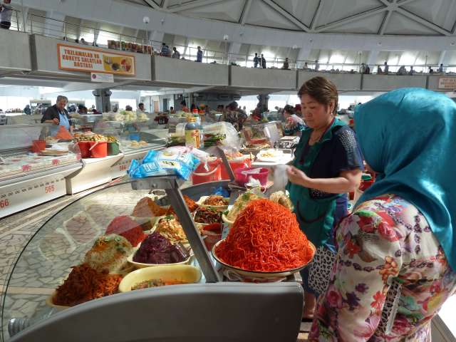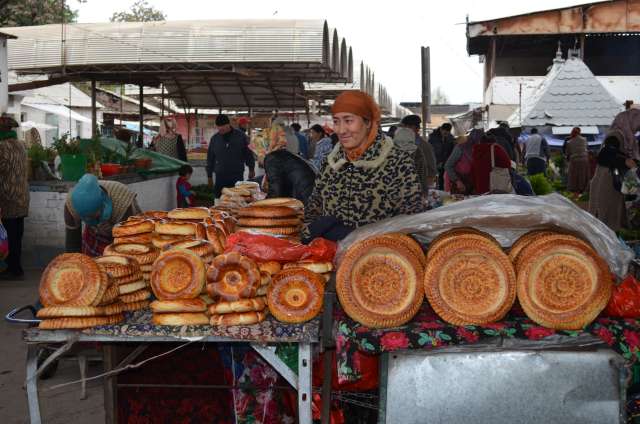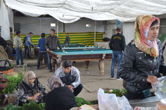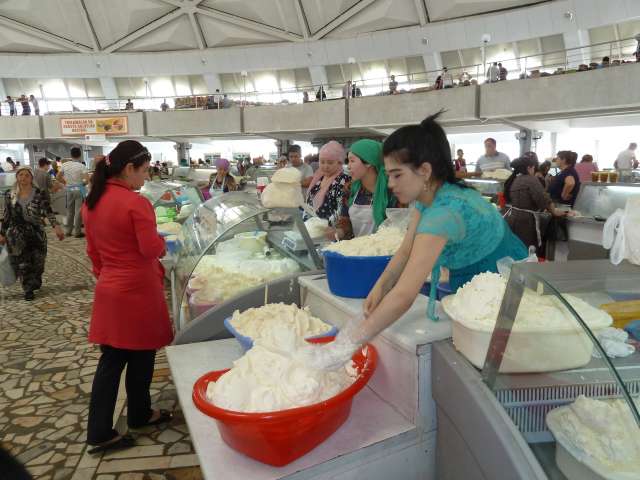Un des hauts lieux  se situe au bazar de Jayma, dont on dit que c’est un des plus fabuleux d’Asie centrale. Découvert un jour de pluie, notre impression est plus mitigée, même si il rassemble dans le même lieu légumes de saison, fruits secs, galettes, fleurs et plants, étals de bouchers, gargottes diverses, vendeurs de souvenirs, de vêtements et coiffes traditionnelles ( le standard pour les hommes étant une espèce de haut de forme en feutre blanc, brodé de noir), smartphones et gadgets électroniques. On y a même trouvé une salle de billard !