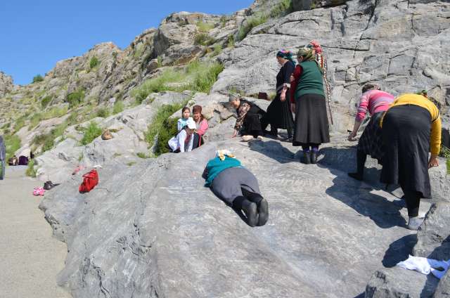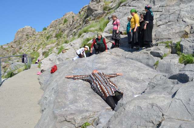 A la descente, surprise de voir des femmes en pèlerinage pratiquant le toboggan sur une dalle inclinée. Est-ce le frottement des vertèbres qui y a creusé un sillon, où la forme du rocher qui a suscité cette coutume ? Par signes, on nous indiquera que c’est bon pour la santé. J’essaierai donc, et j’apprends alors qu’il faut le faire 3 fois ! Comme mes initiatrices, je le ferai sur le dos, sur le ventre, mais pas la tête en bas, pas fou !!