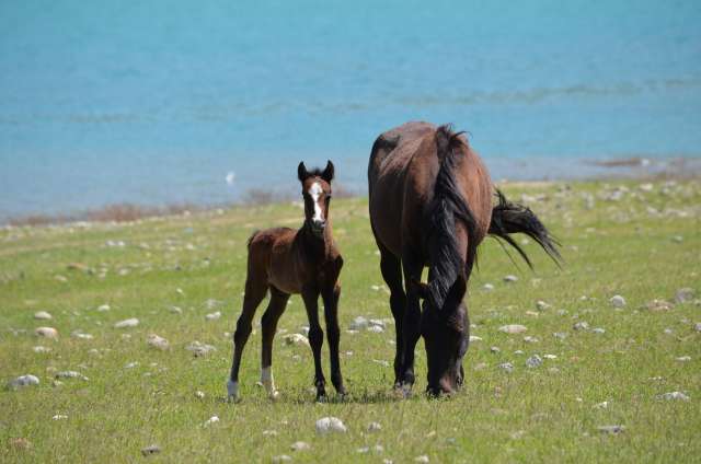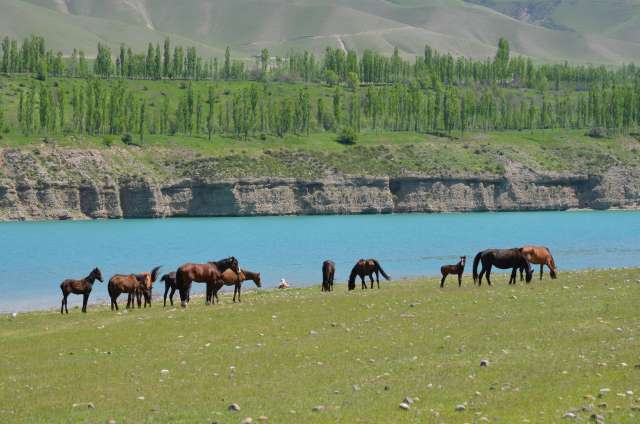 Mais le Kirghizstan, c’est d’abord la montagne et une rapide négo (2500 som pour 4, soit 40€) nous permettra une ballade de la journée en taxi vers Papan, à une cinquantaine de km d’Osh, où nous pourrons crapahuter (un peu..) et pique niquer au bord du lac. La région est belle en cette saison, le ciel s’est dégagé, et les poulinières sont en liberté dans des pâturages où les clôtures sont rares.