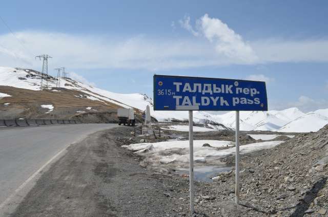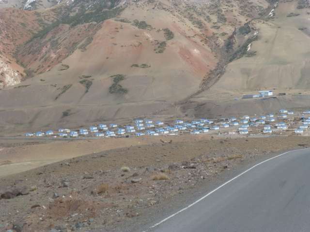 Longue montée régulière, facile, dans de belles gorges où dévalent des torrents grossis par les récentes pluies, puis ça se corse sur les 30 derniers km lorsqu’on quitte la vallée pour attaquer la montée du col de de Taldyck . Nous rencontrons les premières neiges sur les bas côtés, le camion grimpe régulièrement la pente sévère et nous atteindrons le sommet à 3615 m plus aisément que nous ne le redoutions.