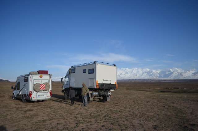 Nous nous installons au point de bivouac qu’avaient utilisé Joel et Josette Braillard il y a 2 ans, leurs photos nous avaient fait rêver : Devant nous, la  face nord enneigée de la chaine du Pamir Alai , derrière la face sud, déjà verdissante, du massif que nous venons de traverser.Entre ces lignes parallèles, un plateau de quelques kms de large, sillonné de rivières coulant Ouest Est, que longe l’une des plus belle routes du monde, quasiment sans virages sur près de 80km, zone de pâtures pour les troupeaux qui constituent la richesse du pays.