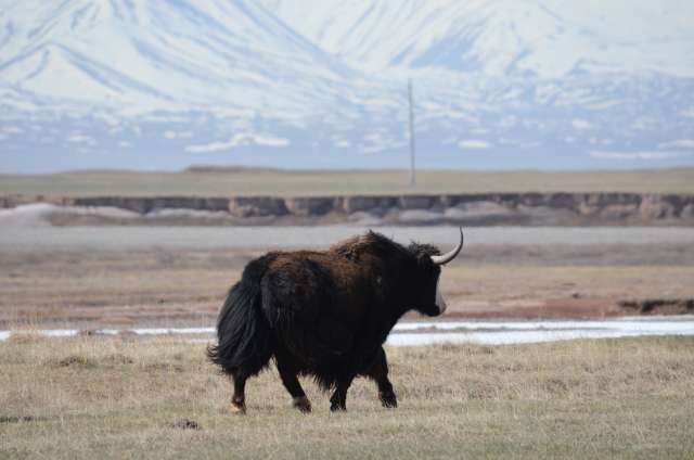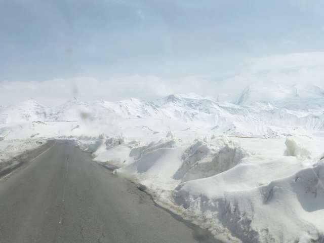 Les deux massifs se rapprochent, le plateau se rétrécit et la route commence à serpenter dans une vallée enneigée. Nous finirons l’ascension du col, à 3790 m, en évitant les congères, sur une route qui reste très belle et fréquentée exclusivement par des poids lourds, chargés de charbon où de bétail.