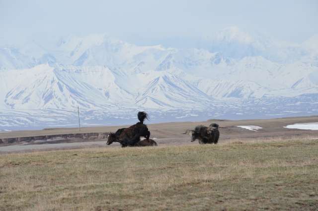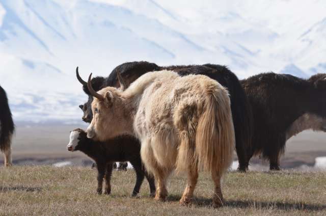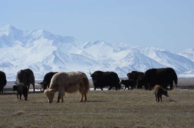 Journée peu chargée, nous en profitons pour rejoindre Sary Moghol, plein ouest, d’où la vue sur le pic Lénine (7162m) serait exceptionnelle. Trop nuageux hélas pour en voir le sommet, mais les troupeaux de yacks, eux, se prêtent à la photo, les plus jeunes nous feront même quelques cabrioles.