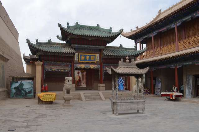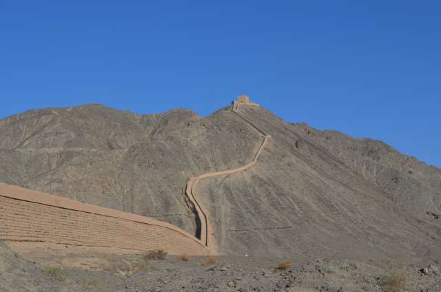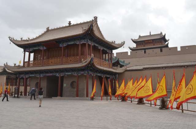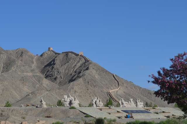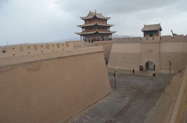 A Jyauguang a été construit sur une hauteur, sous la dynastie Ming, le fort qui faisait fonction de sentinelle de l’Empire. Le plateau séparant les deux chaines de montagne s’y rétrécit et n’a une largeur que de 25km, aisée à contrôler. Le fort est flanqué de deux murs qui barrent le plateau, le mur nord rejoignant les premiers tronçons de la Grande Muraille. A l’est, le monde civilisé, à l’ouest les espaces désertiques peuplés de barbares où l’on exilait les bannis et les fonctionnaires en disgrâce. La porte de l’ouest y gagna le nom de « Porte des soupirs… »