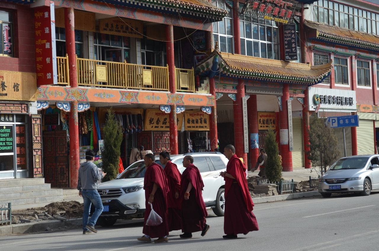 Descente vers Langmussi dans les nuages. Toute petite ville peuplée de Hui et de Tibétains, avec son quartier musulman, plutôt délabré et sa partie bouddhiste où fleurissent temples et stupas.