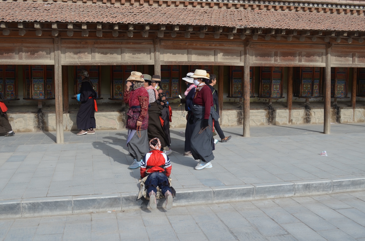 Matinée au monastère de Labrang, « université » de la secte des « Bonnets jaunes ». Cette lamaserie, fondée en 1709 par un moine devenu l’incarnation du Bouddah vivant, 3° rang dans la hiérarchie tibétaine, fut fermée pendant la révolution culturelle et couvre une partie de la ville.
