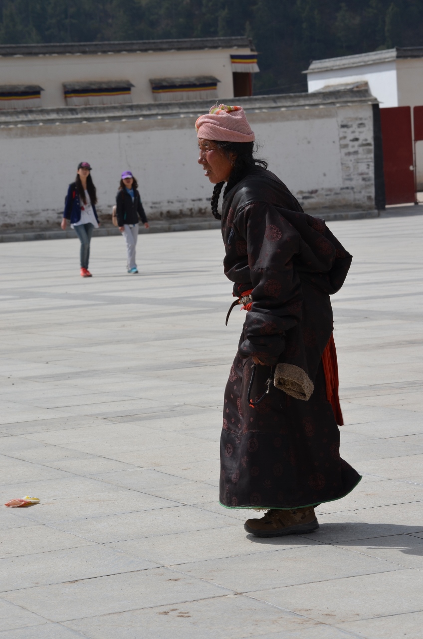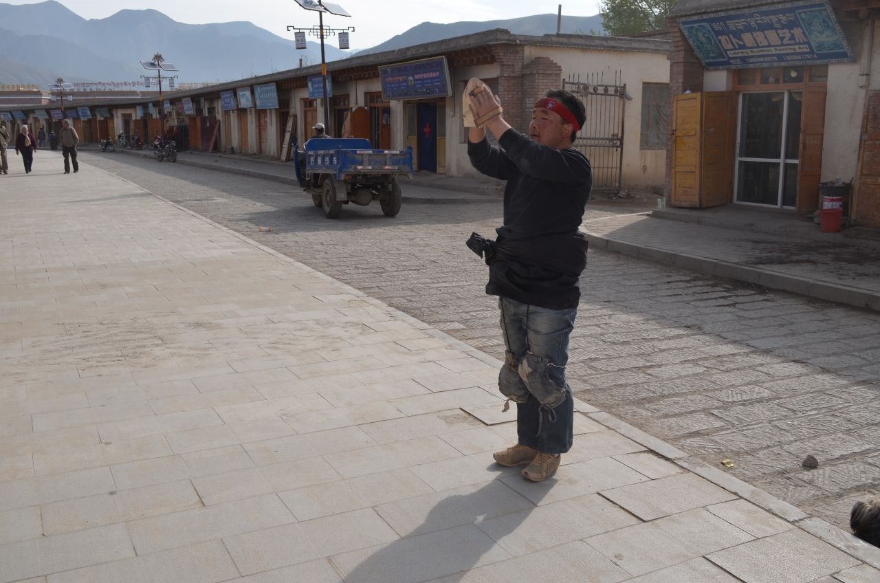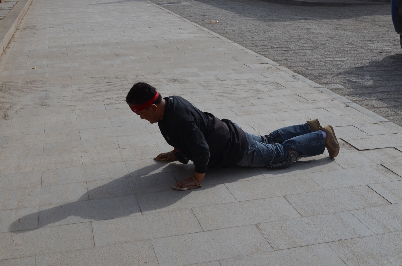 Ils remontent la longue allée menant au temple, soit en faisant tourner chacun des 1080 moulins à prière qui la bordent, soit en accomplissant un véritable chemin de croix : Allongé, debout, mains levées puis sur la poitrine, allongé, un pas de coté et on recommence, sur 1 km.