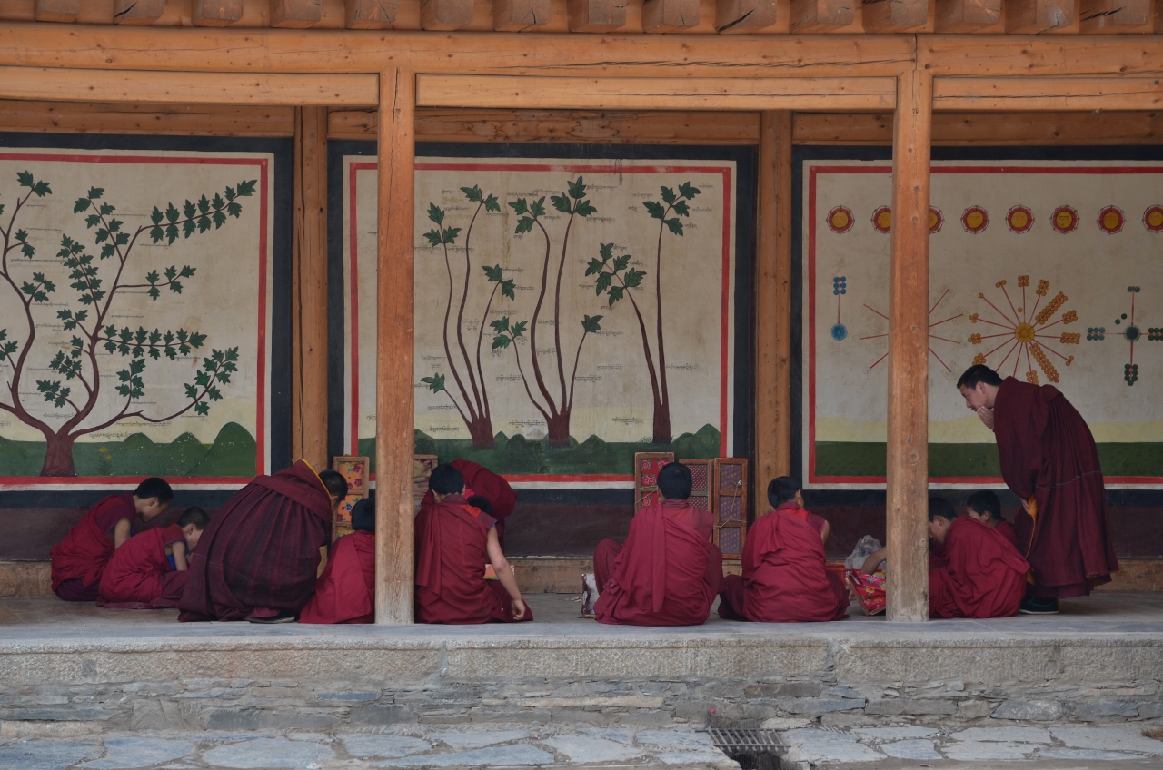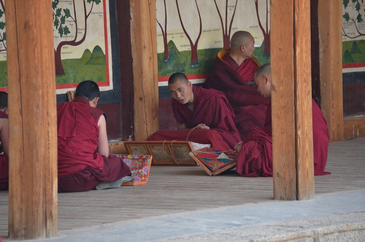 Les moines se consacrent à l’étude et à la prière dans les temples ou les galeries, parfois distraits de leur tâche par l’intérêt qu’ils portent aux visiteurs étrangers.