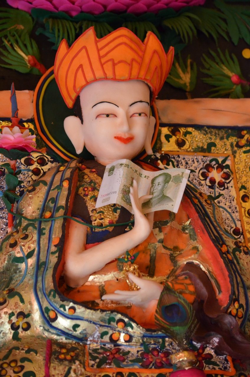 Curieux paradoxe dans une des rares salles où les photos sont permises, qui abrite des figurines en peau de yack : Un bouddha qui tient entre ses doigts un billet à l’effigie de Mao…
