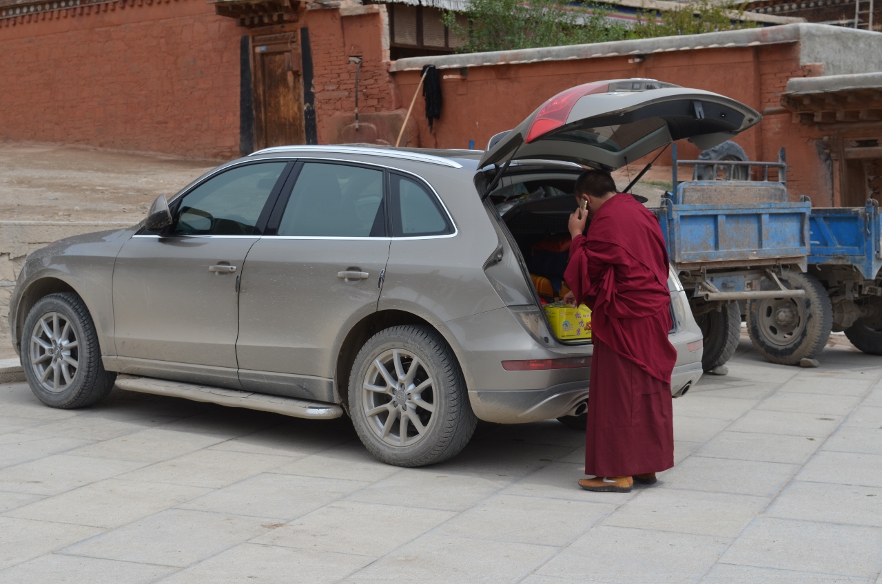 Visite des temples, partout des statues de bouddha, bien sûr, dans une ambiance étrange de clair obscur et l’odeur du beurre de yack rance qui alimente les lumignons. Les pèlerins déposent de la nourriture aux pieds des moines en prière et de l’argent à chaque autel, parfois accompagné de demandes de prières. Nous assisterons au comptage de la monnaie dans un des temples, les demandes de prières seront ensuite réparties entre les moines pour les effectuer.