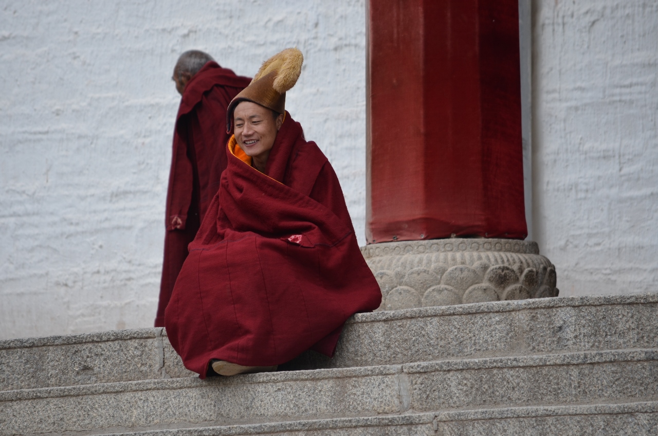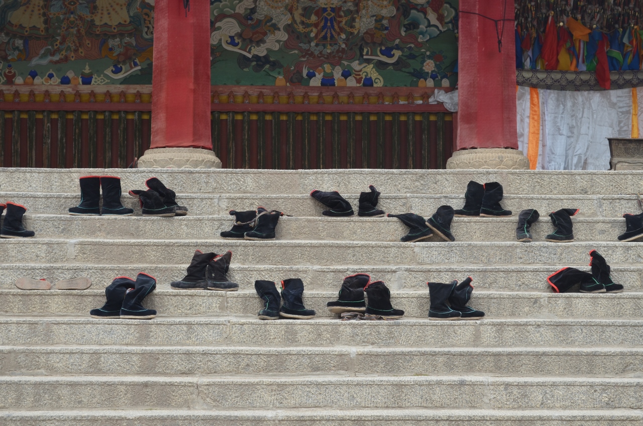 Nous assisterons à « l’entrée des moines ». A l’occasion de cérémonies,, qui reviennent fort cher aux familles qui les sollicitent, les moines se rassemblent progressivement sur les marches de la grande salle des Sutras où ils s’installent pour psalmodier jusqu’à ce que, au signal de trompes entonnées par deux moines sur le toit, ils se précipitent dans la salle pour la cérémonie, abandonnant leurs bottes de feutre sur les marches