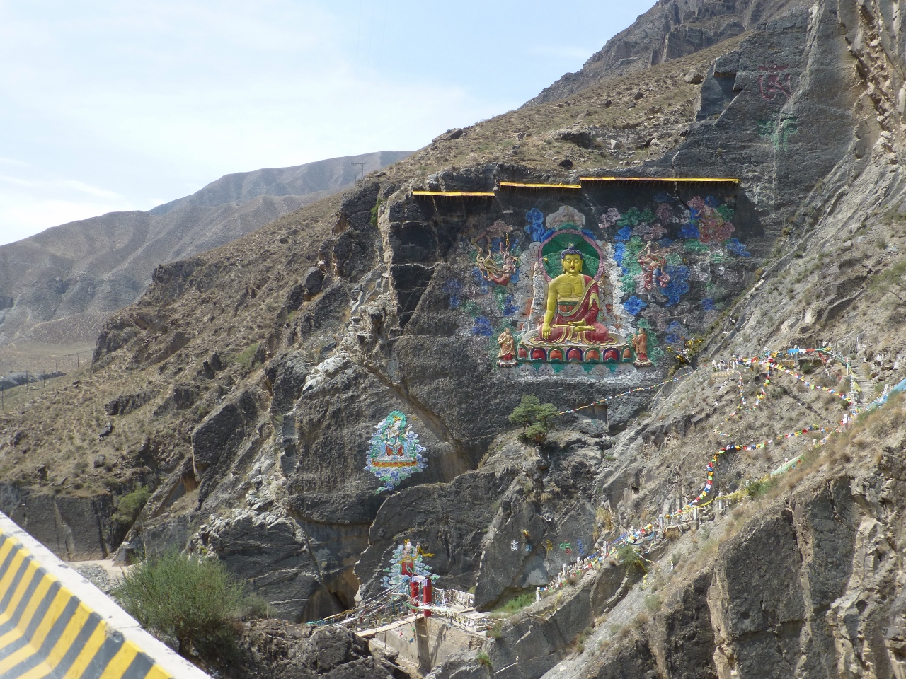 Nous suivons l’axe autoroutier en construction qui emprunte les gorges du fleuve jaune, où on pratique l’aquaculture puis nous dirigeons plein sud vers Tongren. La route est ornée de peintures tibétaines, bordée de stupas et de ces faisceaux de rubans de prières qui tiennent lieu d’ex voto.