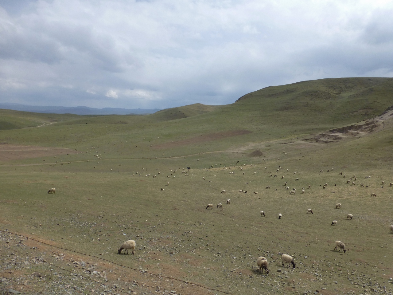Etape de liaison comme l’écriraient les journalistes sportifs. Nous piquons sud est en direction de la chaine  des Quilian shan. La plaine s’élève lentement et nous gagnons 1200m d’altitude sur 100km en une seule ligne droite. Traversée des Quilian par un premier col à 3686 m, encore 220km jusqu’à Xining, puis long plateau parallèle au deux chaines à 3500m d’altitude, pâturages, yacks et moutons, 2° col, 2° plateau  et franchissement des Datong shan par un 3° col à 3785 m, raide celui là et descente itou, dans les nuages, à 118km de Xining  pour terminer par 80km d’autoroute.