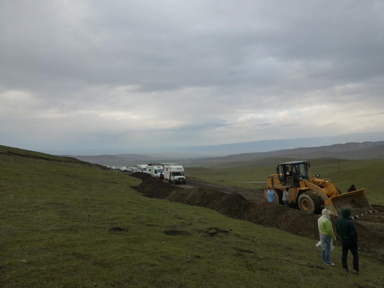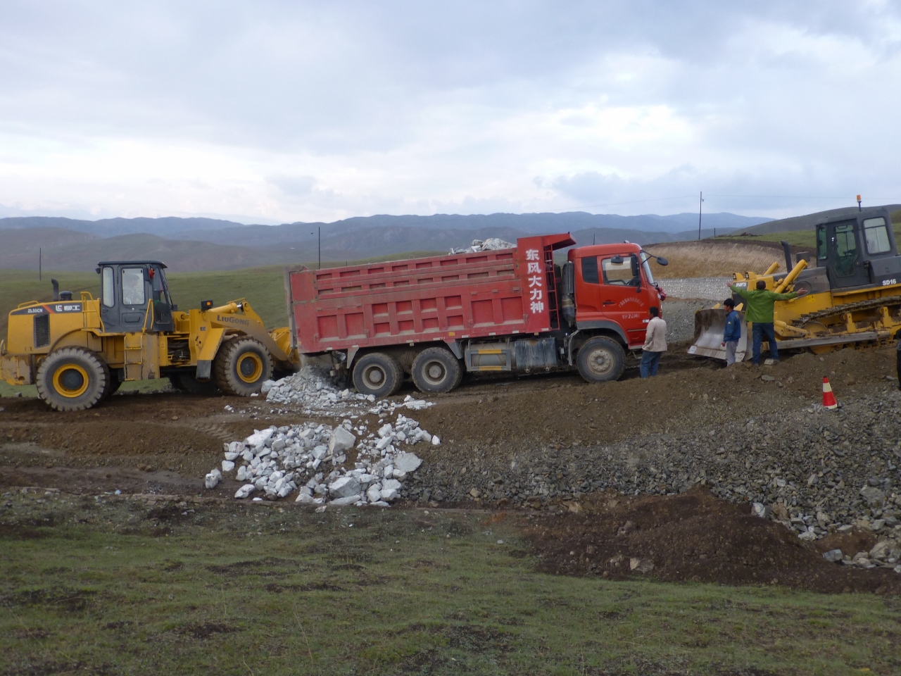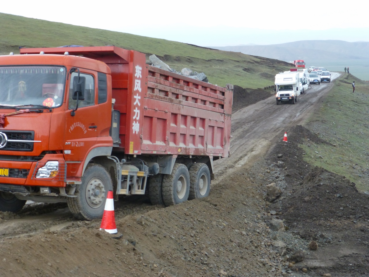 Les camping car franchiront avec succès les obstacles, mais nous serons de nouveau bloqués par un semi remorque qui patine sur la chaussée trop grasse, nous devrons l’aider en étalant de la terre sèche sous ses roues. Col franchi, longue descente entre chien et loup vers Xiahe, sur une route en chantier.