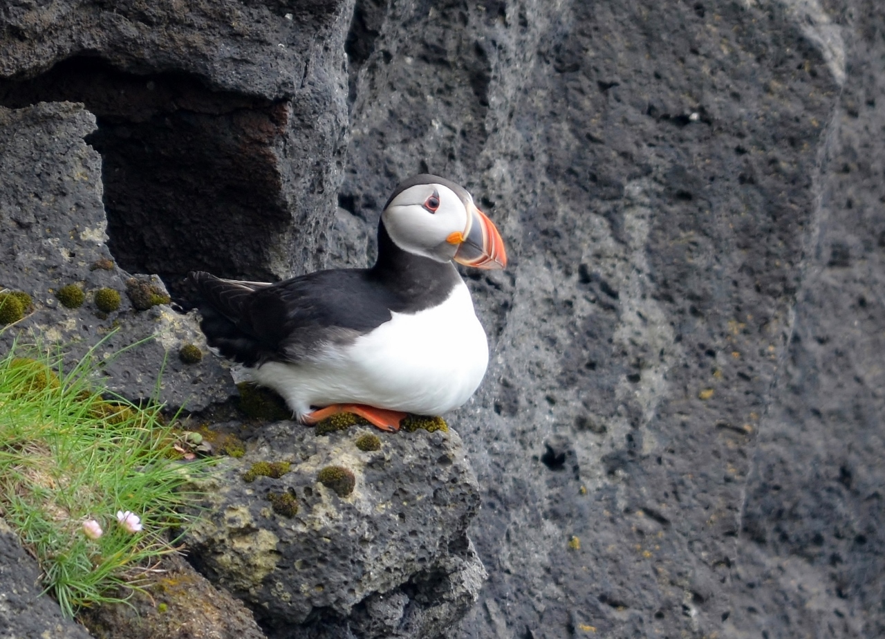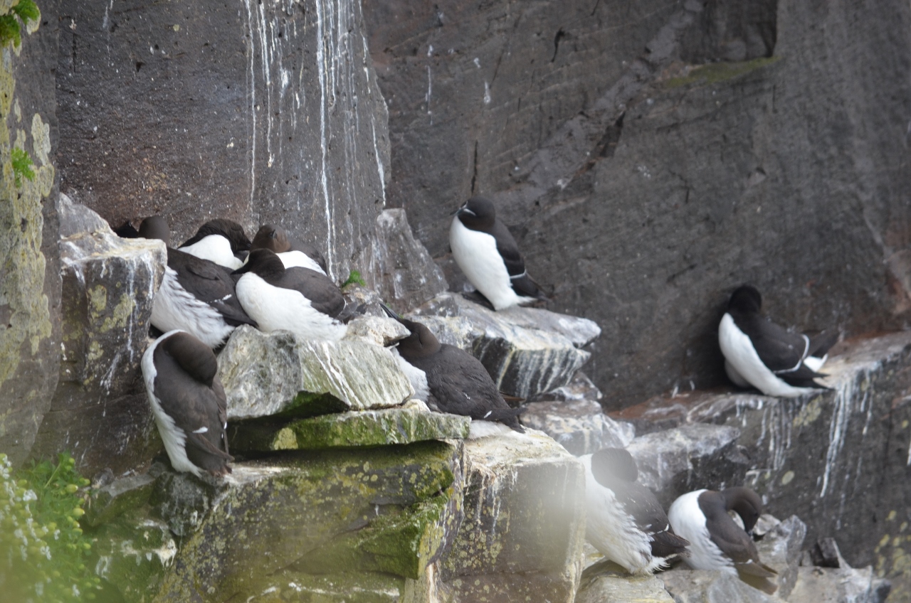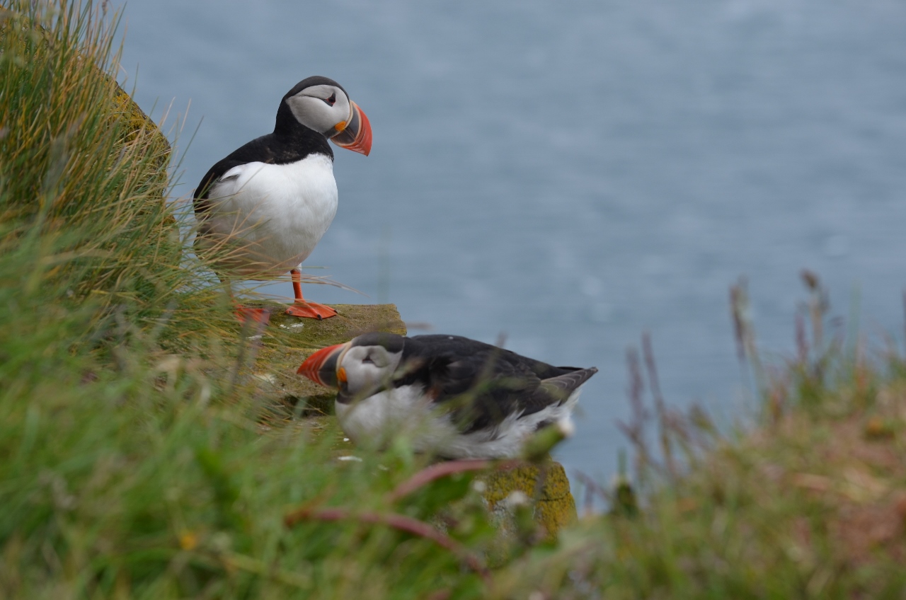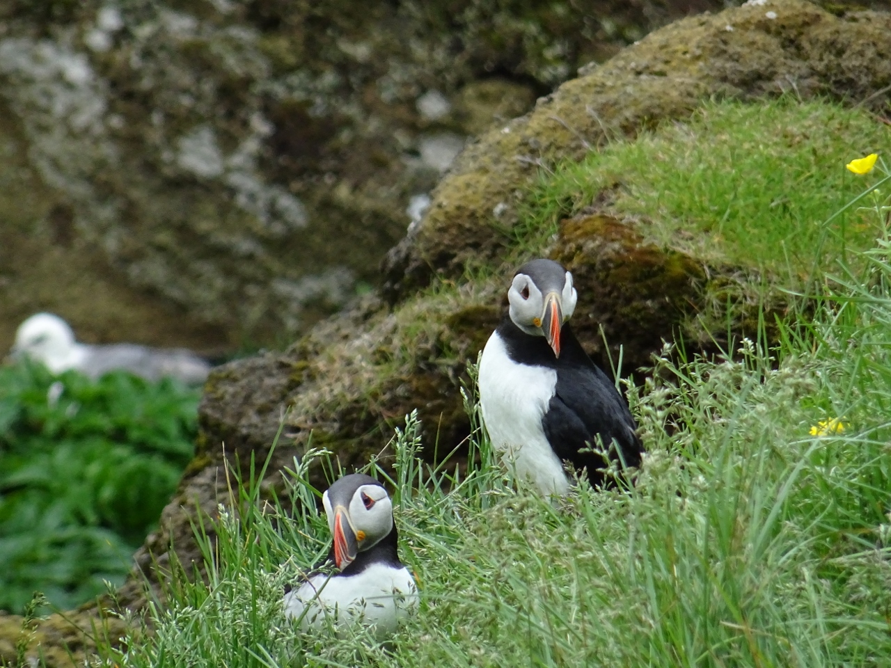 Curieux oiseaux, aux ailes très courtes et bourdonnantes, qui vivent en pleine mer 8 mois par an, et ne viennent à terre que pour nicher au fond de tunnels creusés grâce à leur puissant bec. Nous aurons la chance d’en approcher un à 20m, à son poste d’observation, dans la falaise.