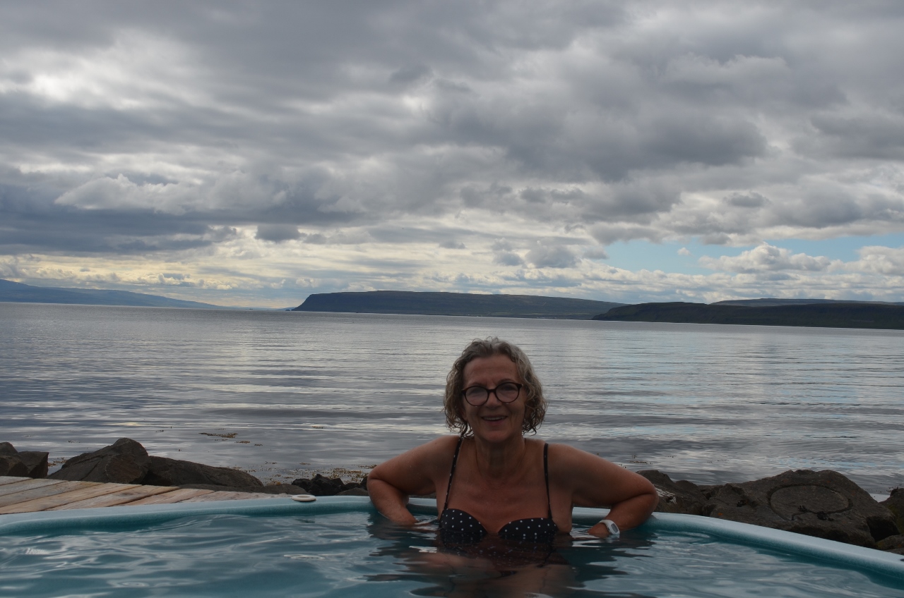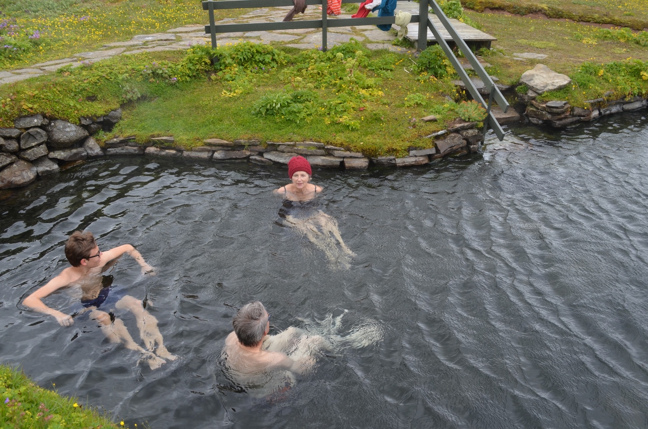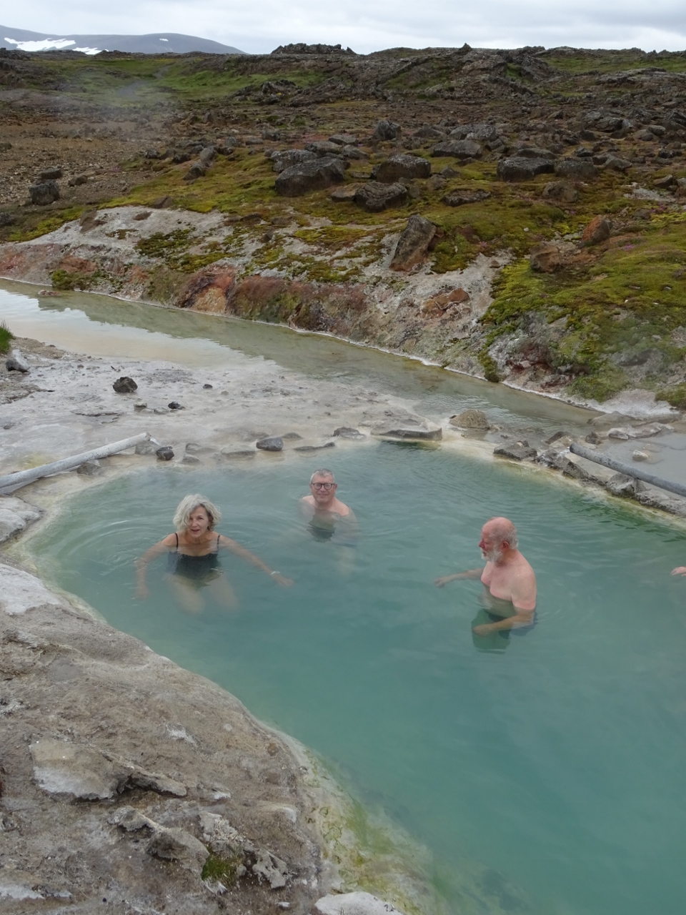 La piste 735 vers le glacier est fermée, donc longue marche vers le cratère Strykur, puis, au retour, bain obligé dans le « hot tub », en plein air, bien sûr. Quand on se déshabille, dans le vent coulis, on se dit que l’on est près du cercle polaire et on pense, comme Danny Glover dans « l’Arme fatale » : « Je suis trop vieux pour ces conneries.. ». Mais après, quel délice : L’eau collectée en amont sort d’un tuyau entre 80 et 100° et il faut la mélanger avec  l’eau glacée de la rivière. On y séjournerait volontiers plus longtemps mais on fuit des malotrus (je pèse mes mots, j’aurais volontiers utilisé un mot commençant par con.. et finissant par ..nards), français hélas, qui, plongés jusqu’au cou, y prennent pendant deux heures l’apéro, bières et chips d’une main, smartphone de l’autre ! On espère que, les mains en l’air, ça leur aura filé des crampes…