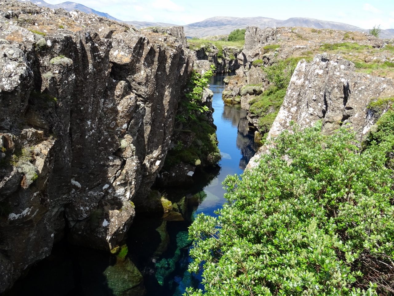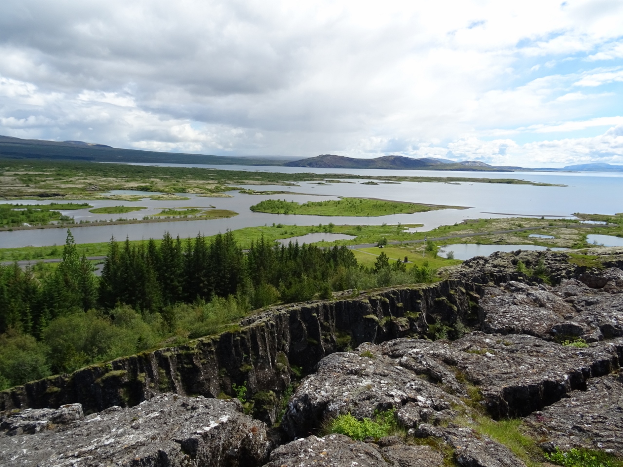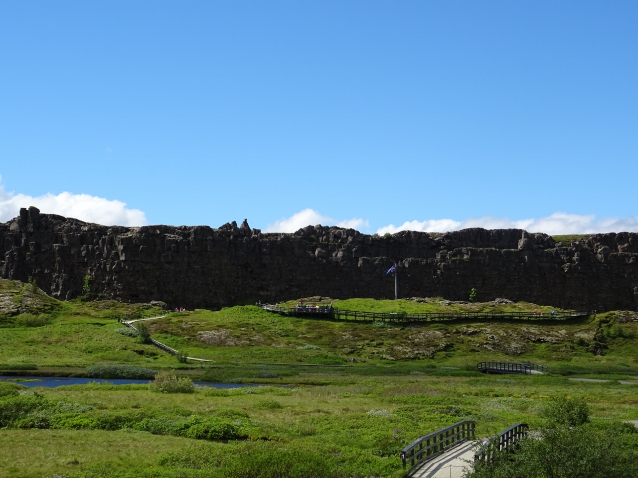 Passage obligé par Pingvellir. Ce site est LE site historique de l’Islande, remarquable à double titre : C’est un des lieux où se manifeste l’écartement des plaques tectoniques européenne et nord américaine. La faille qui en résulte s’élargit de 5 mm par an et est ici nettement visible par les falaises qui la bordent et par la dépression qui s’est créée, occupée par un lac.