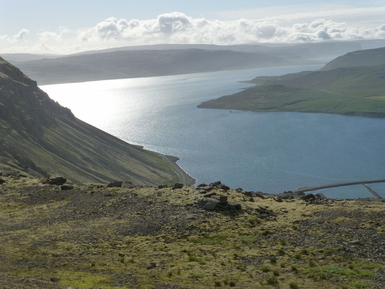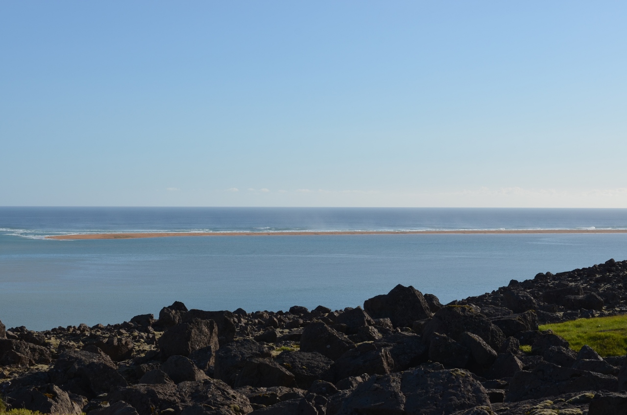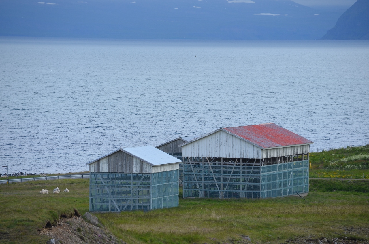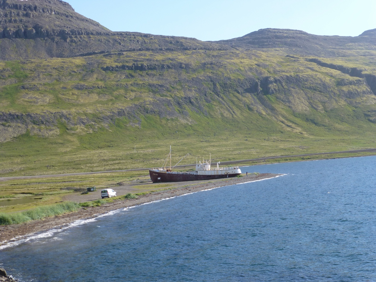 Nous  terminons enfin cette randonnée vers le nord par un saut au micro port de  Kopasker. Pas grand-chose à voir dans ce « village de services pour les agriculteurs de la région » (ça veut dire qu’il y a un abattoir et une usine de produits carnés, où finissent ces mignons agneaux qui agrémentent le paysage et épicent notre conduite en traversant sans bêler avant). Belle vue cependant sur les péninsules enneigées, de l’autre côté de la baie, agréable par les 24° ambiants.