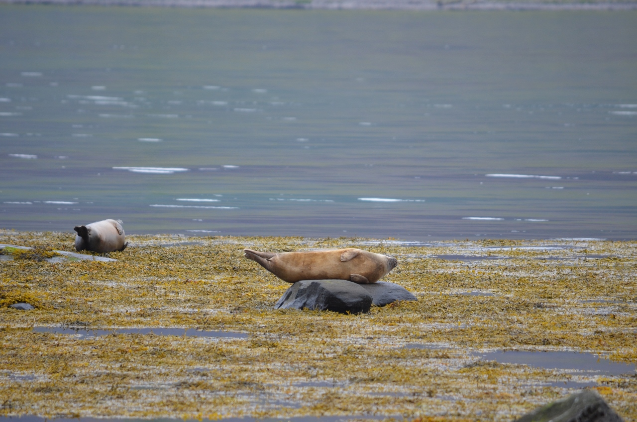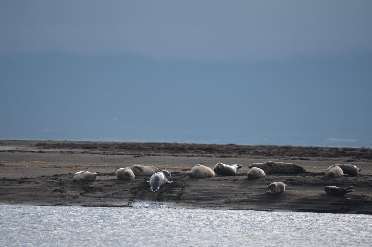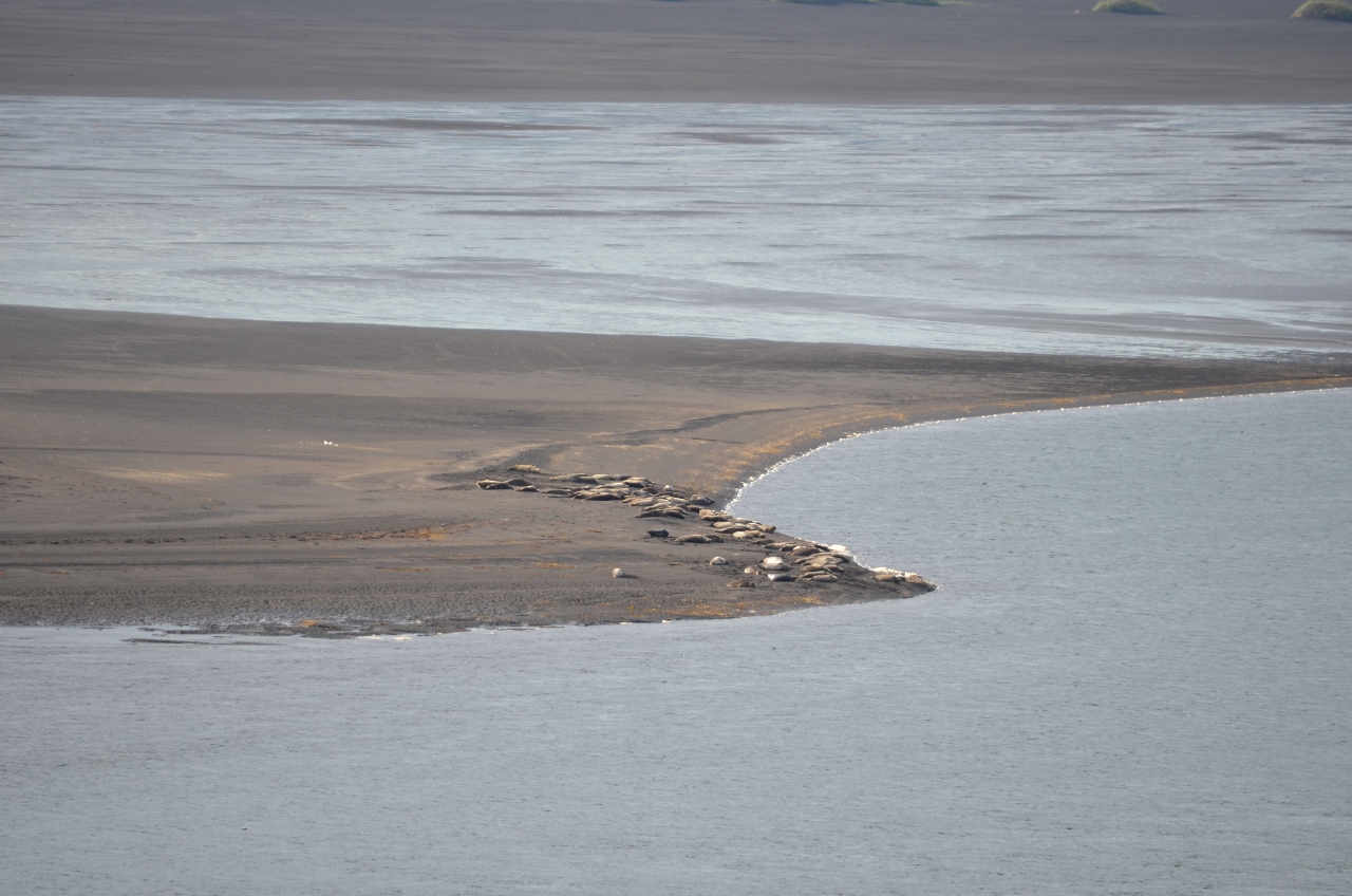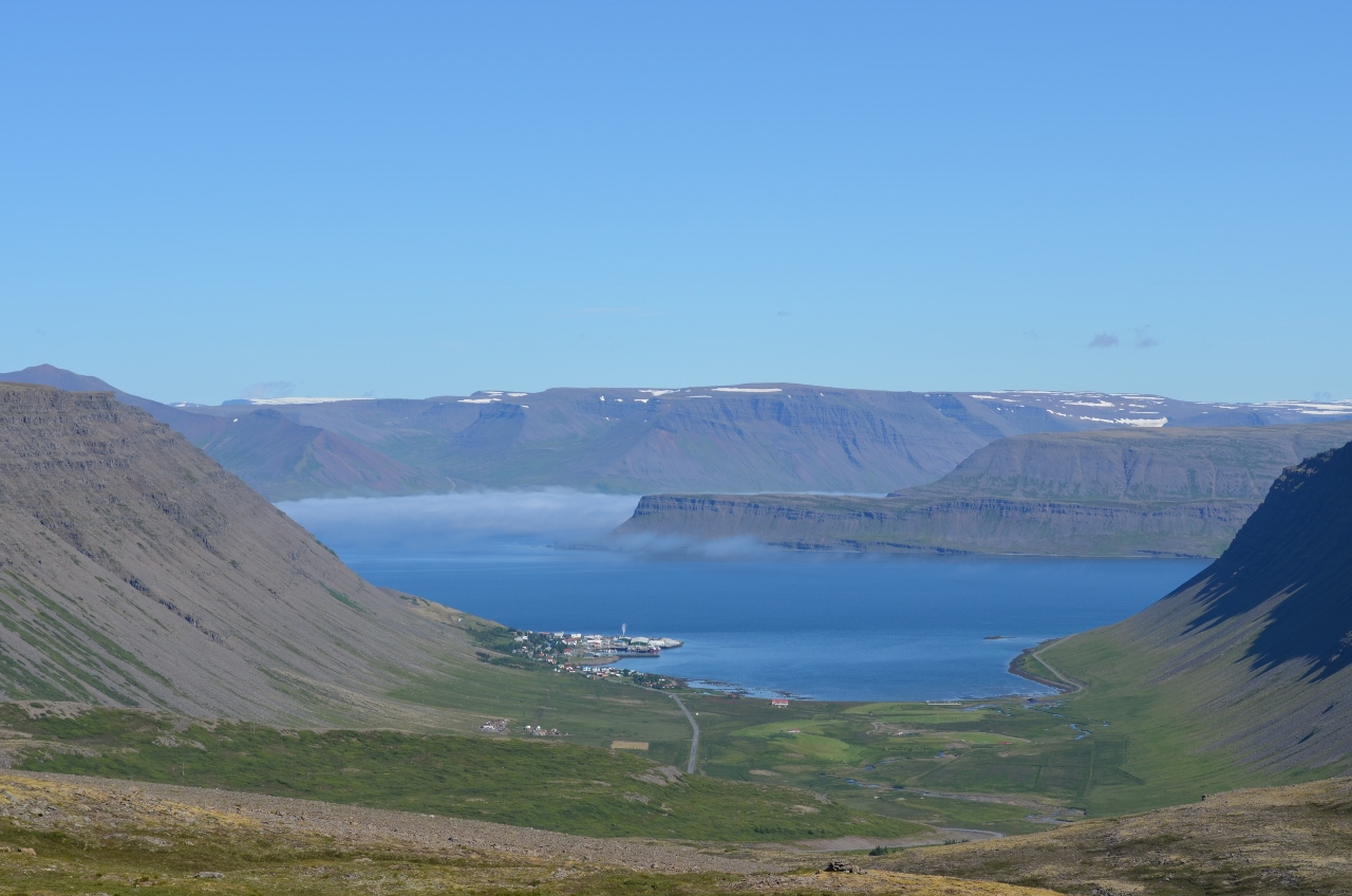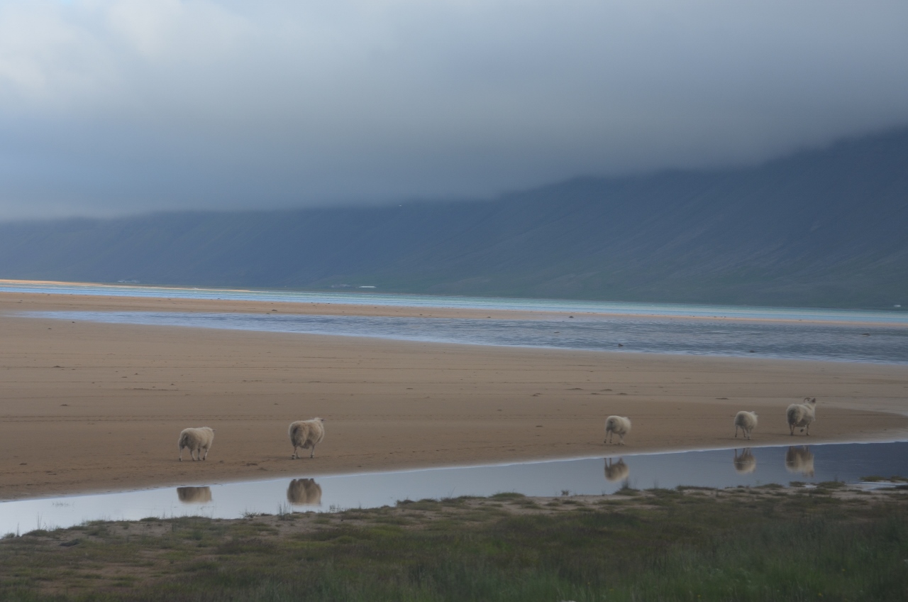 Nous  terminons enfin cette randonnée vers le nord par un saut au micro port de  Kopasker. Pas grand-chose à voir dans ce « village de services pour les agriculteurs de la région » (ça veut dire qu’il y a un abattoir et une usine de produits carnés, où finissent ces mignons agneaux qui agrémentent le paysage et épicent notre conduite en traversant sans bêler avant). Belle vue cependant sur les péninsules enneigées, de l’autre côté de la baie, agréable par les 24° ambiants.