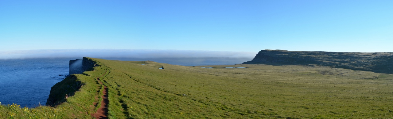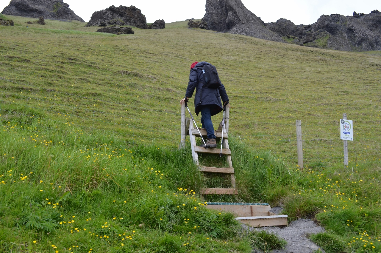 Journée crapahut, on cherche toujours les macareux, mais on cale dans l’ascension d’un ancien cratère, sentier trop raide,  il faut même escalader les clôtures sur des escabeaux fixes. Nous redescendrons trop tôt, car ces oiseaux quasi mythiques reviendront après notre départ !