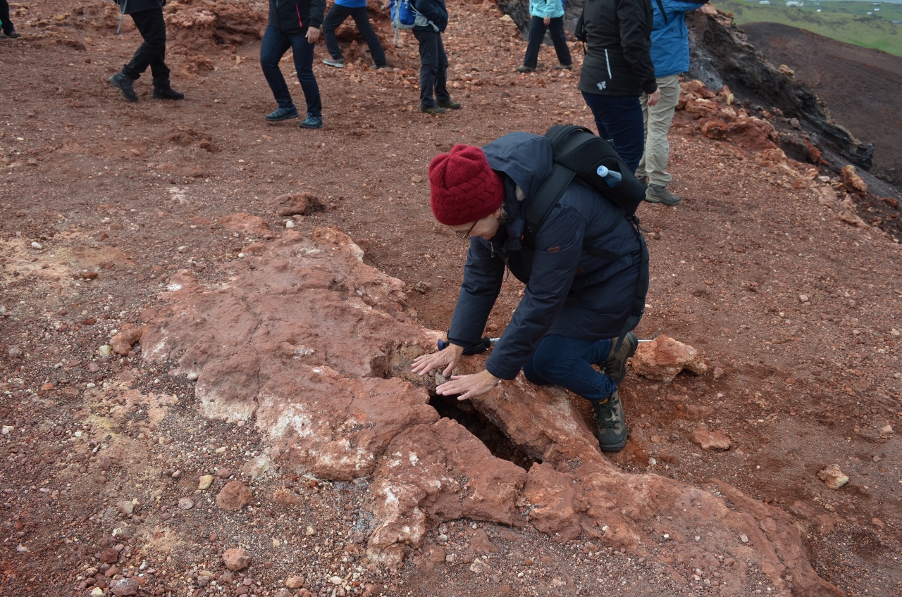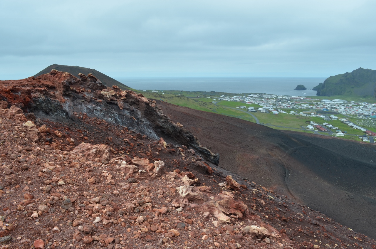 L’escalade du volcan Eldfell est un passage obligé. Au sommet, on aperçoit l’Helgafell voisin et on peut se réchauffer aux  émissions qui s’échappent des cavités qui jalonnent la crête: la bête n’est pas morte.