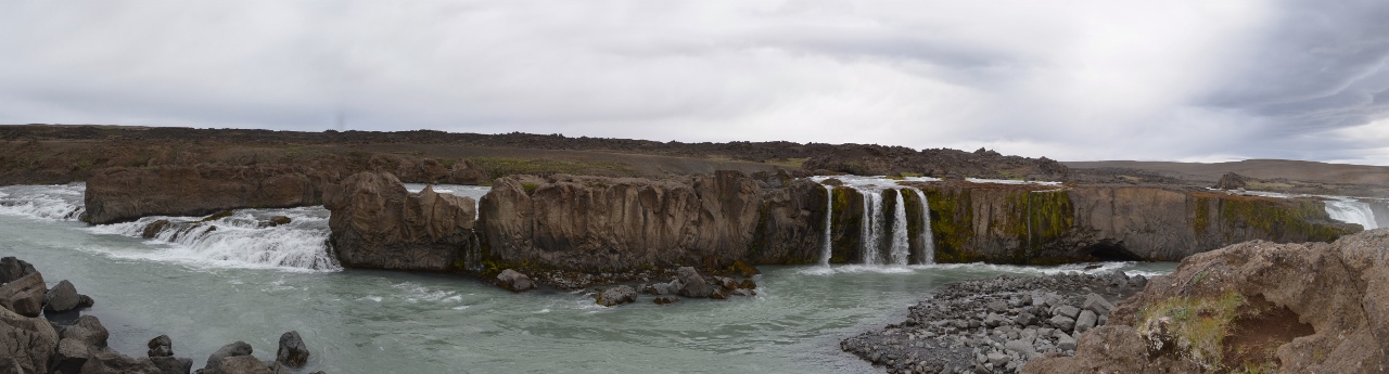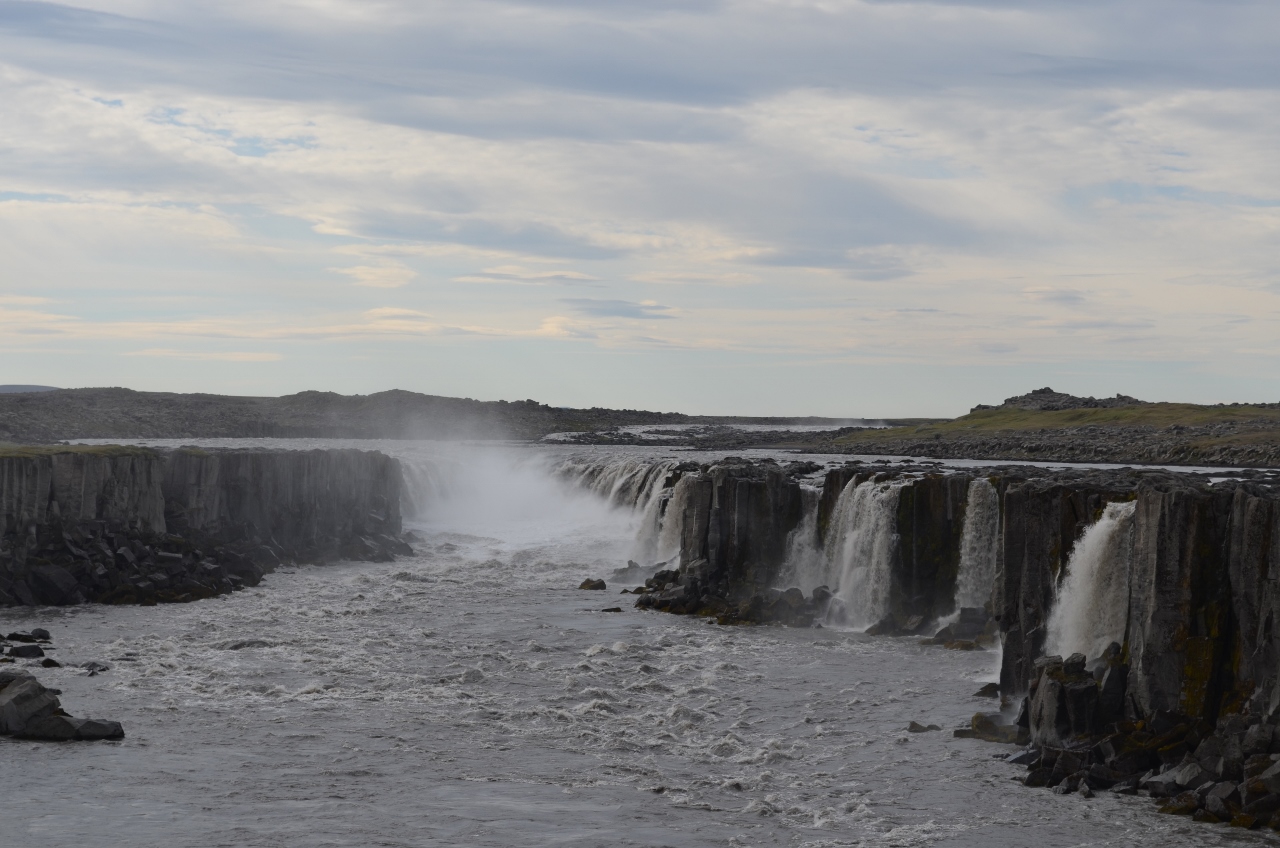 Detifoss, les plus grandes chutes d’Europe avec une hauteur de 45 m, une largeur de 100 m et un débit moyen de 200 m3 seconde, doublé en été, puis chutes de  Selfoss à 2km au sud.
