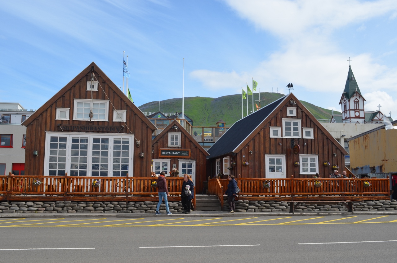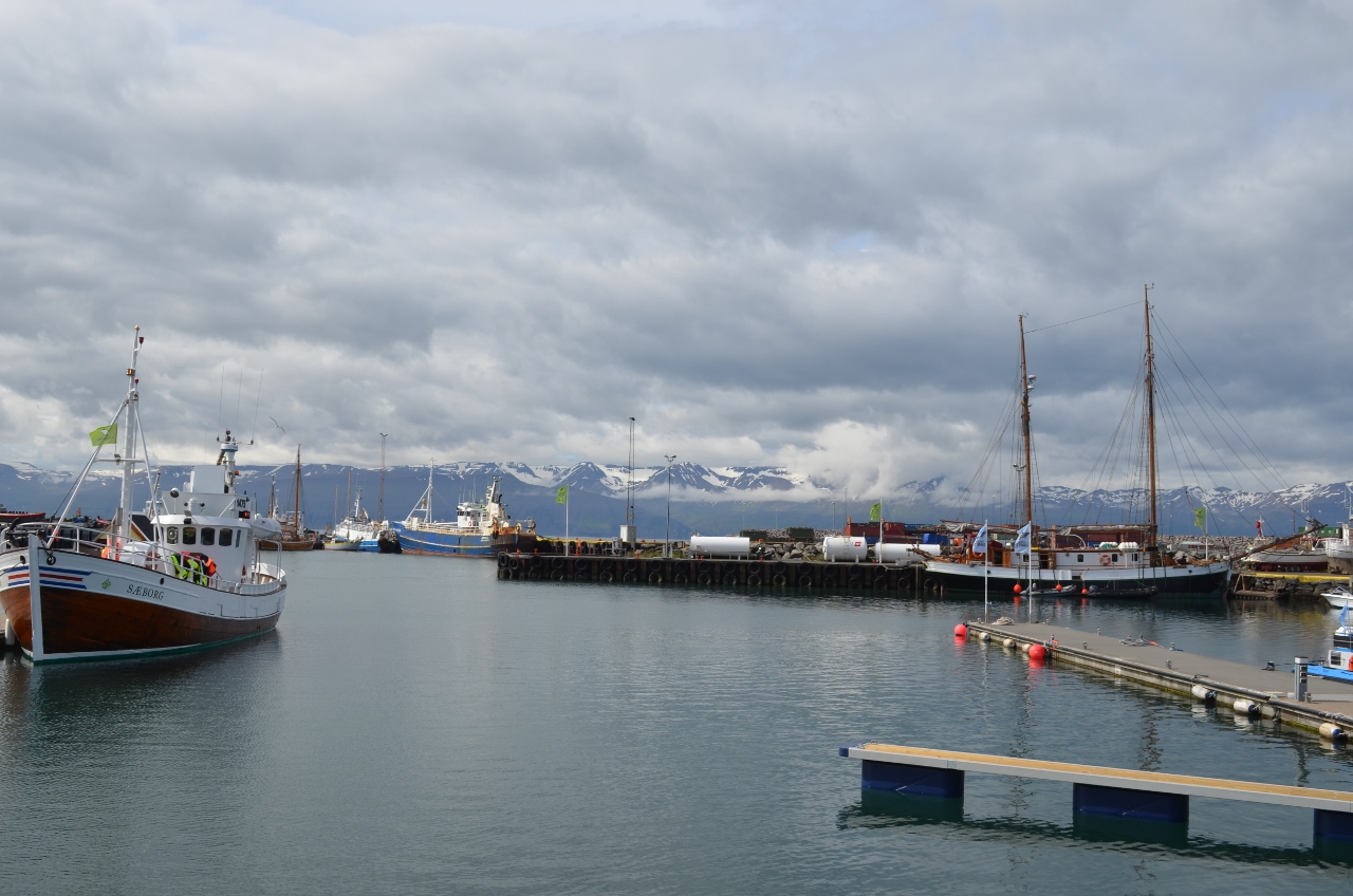 Arrivée dans l’après midi à Husavik, un des hauts lieux des croisières vers les baleines. Les camping cars encombrent les quais et les bus libèrent leur groupes de touristes en continu, mais le port est joli.