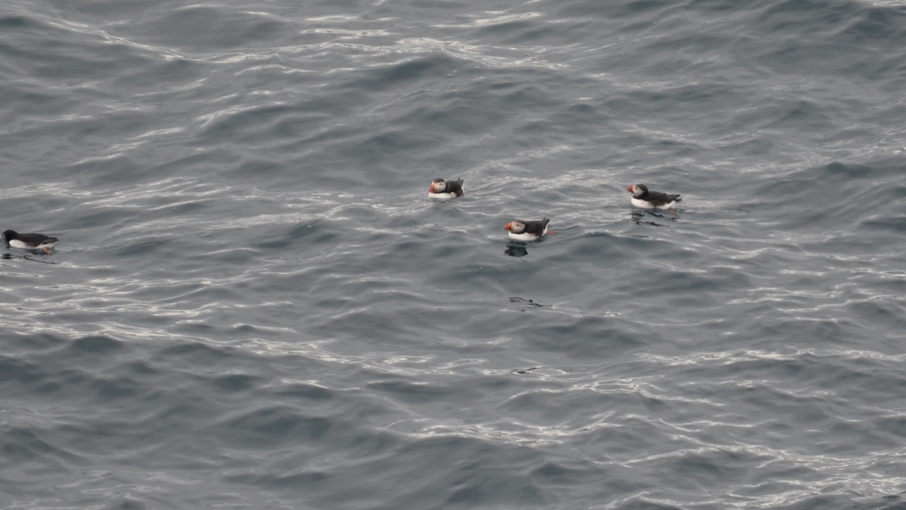 On insiste cependant, longe le magnifique terrain de golf, sur les falaises, observons de nombreux sternes au nid  puis  sommes enfin récompensés : Les macareux, ou « puffins » attendent l’heure, en surfant sur la vague.